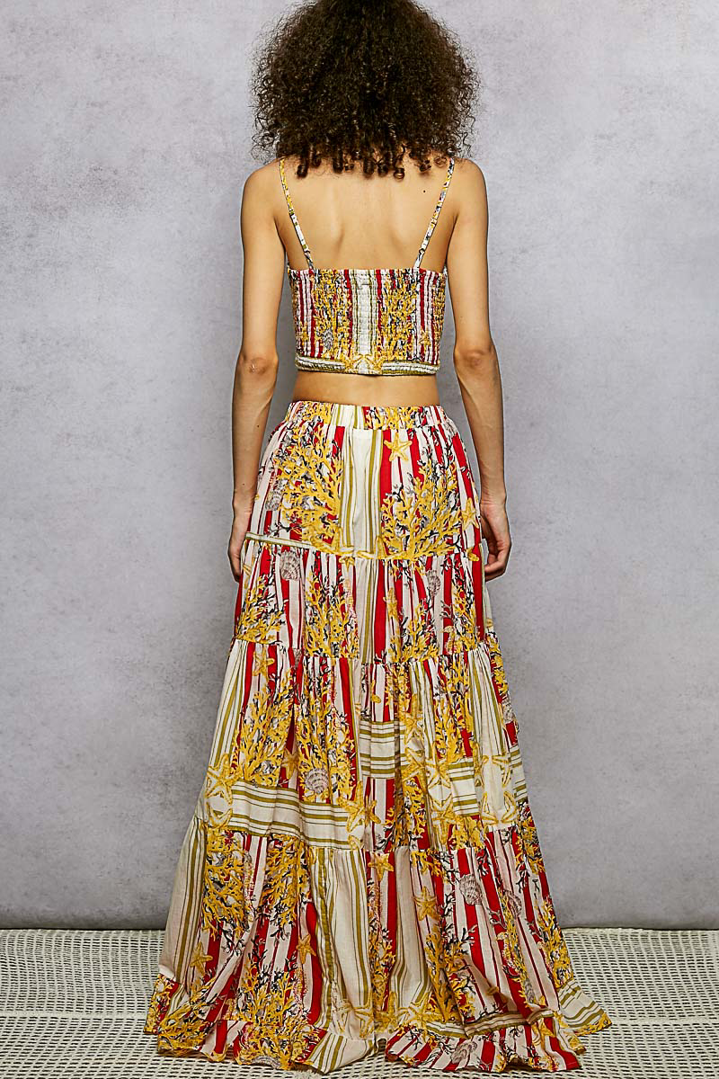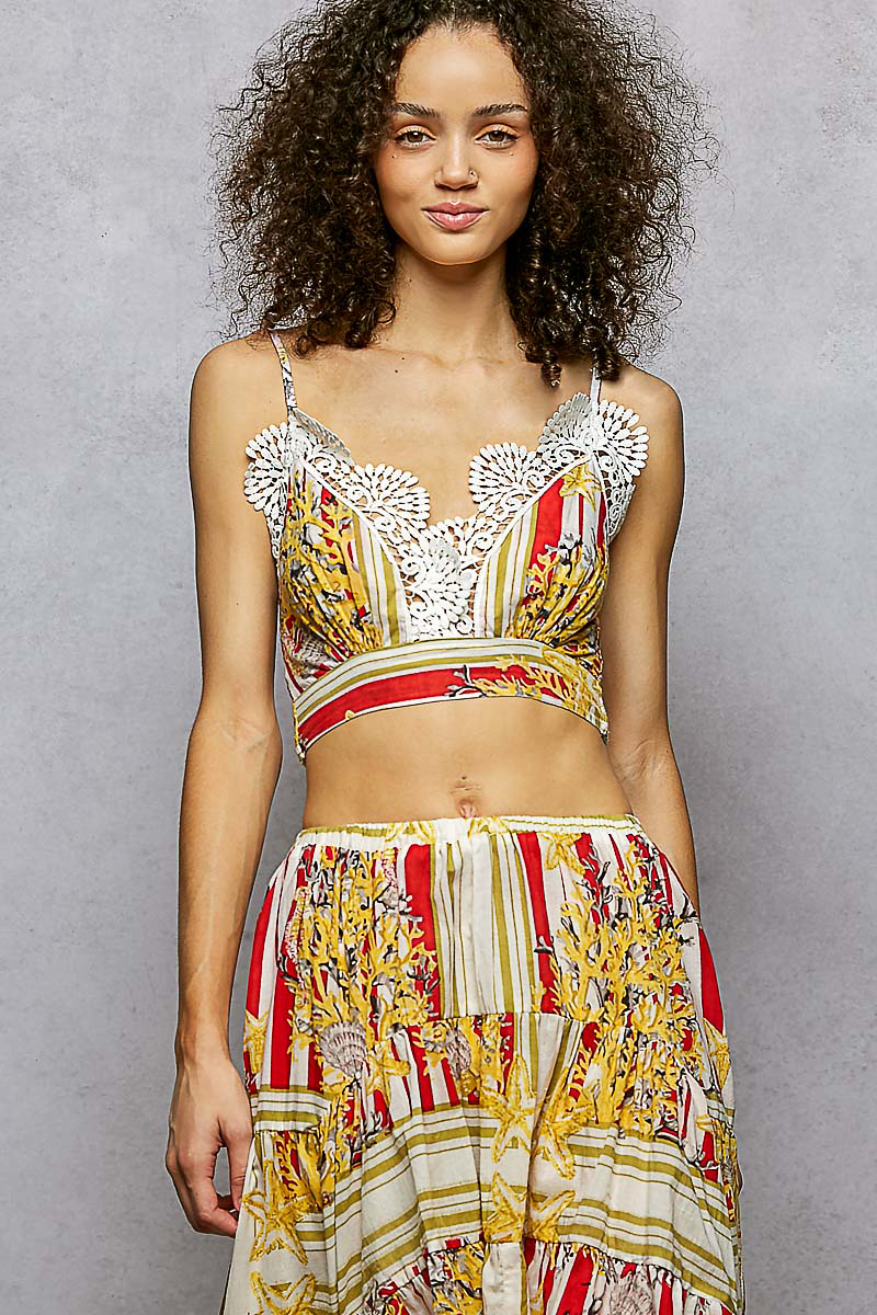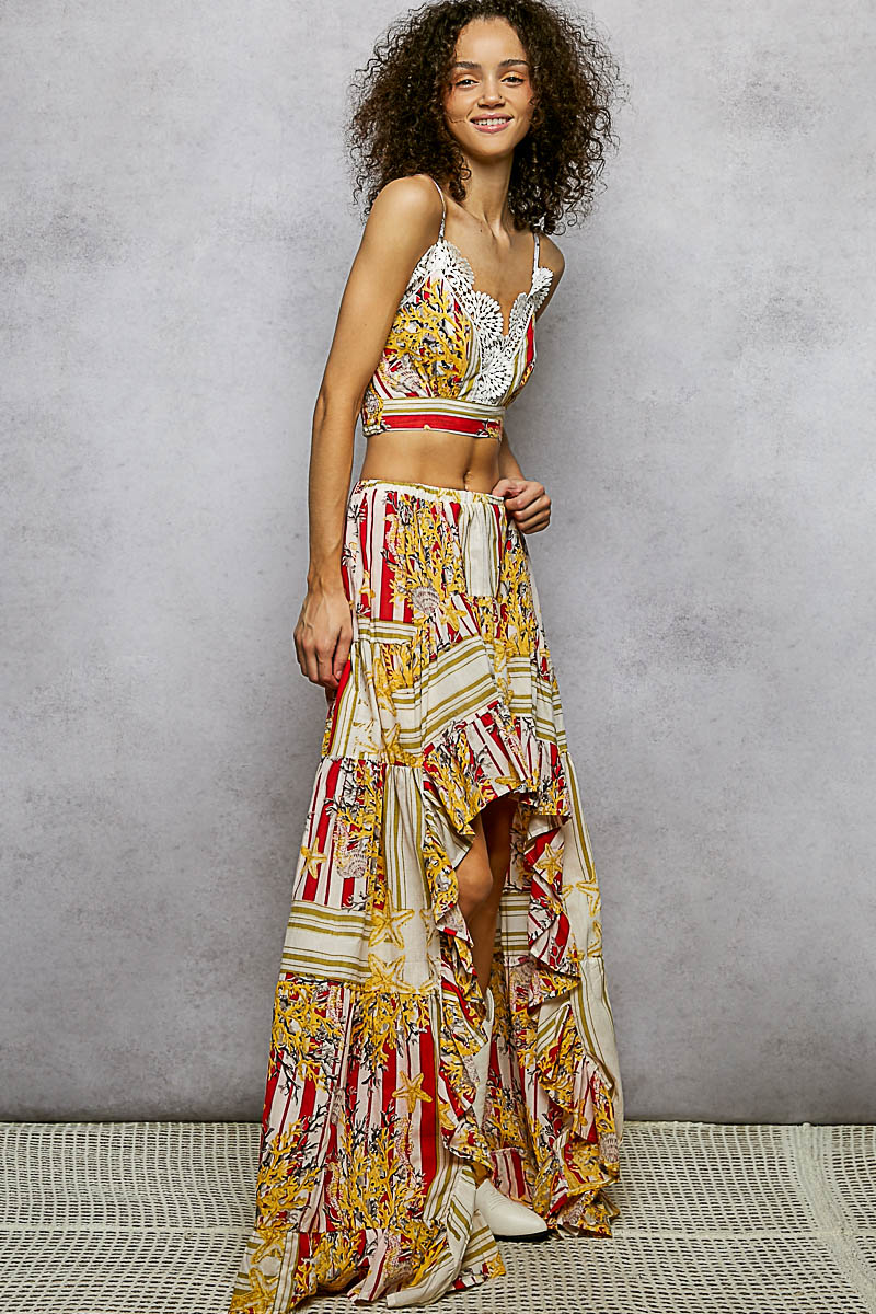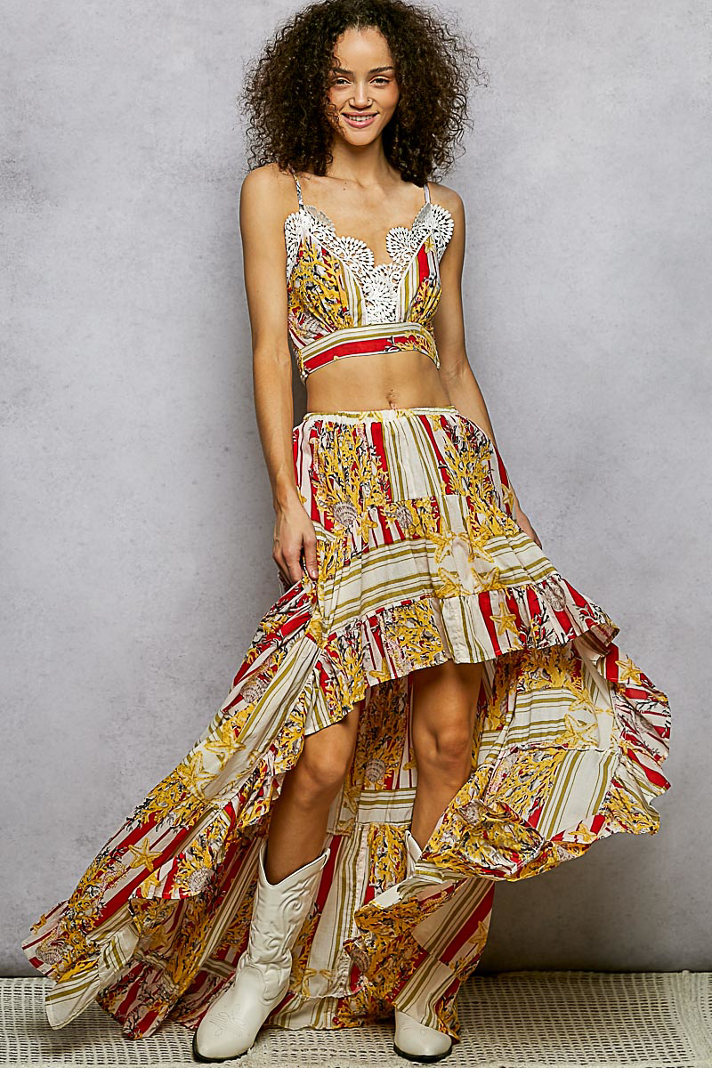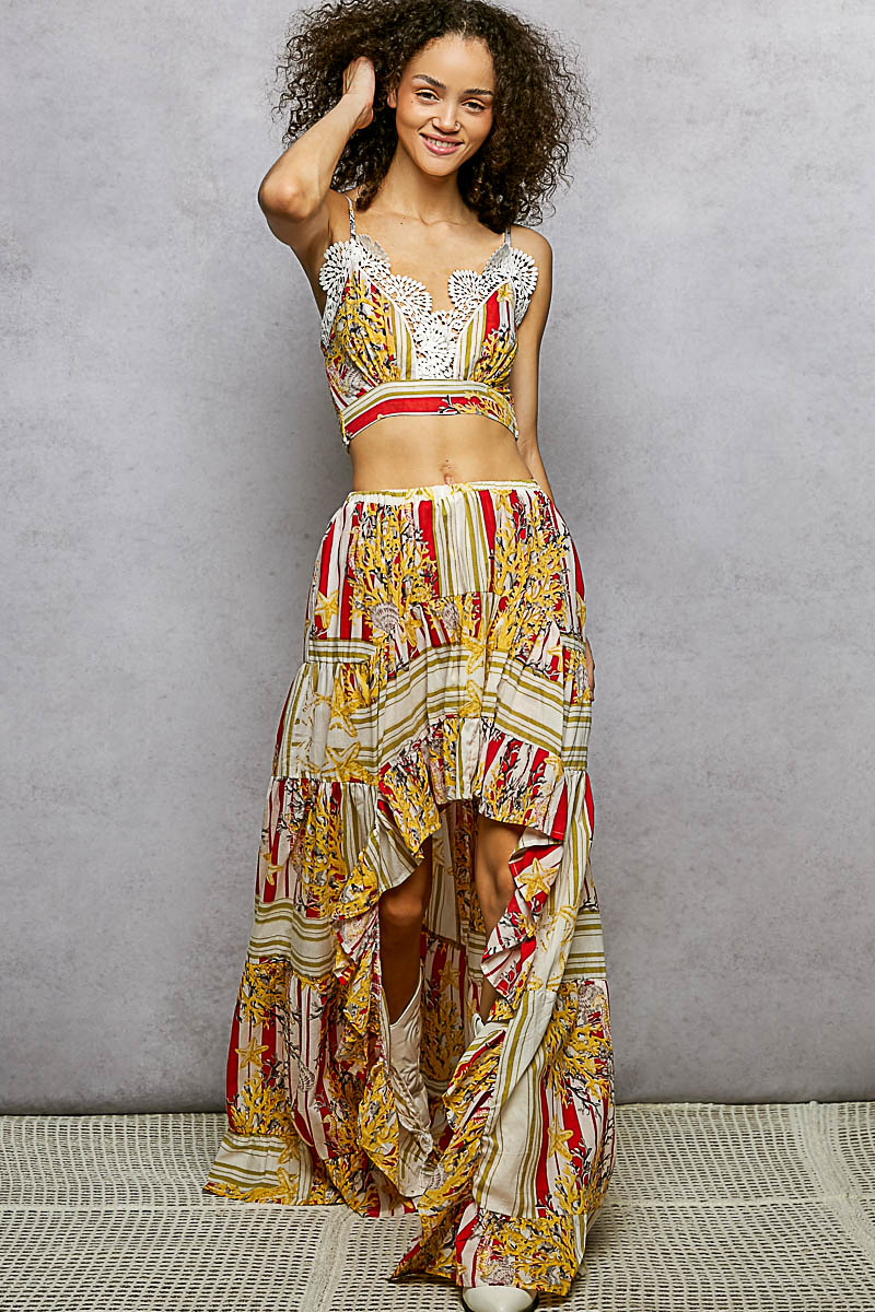 This set features a stylish crop top with delicate lace detailing and a matching high-low skirt adorned with a vibrant floral print. The lightweight and breathable fabric ensures comfort, while the unique design makes it perfect for summer events and bohemian-inspired looks. The set is made from a blend of rayon and polyester, offering a soft and flowy feel. Its versatile nature allows for easy dressing up or down, making it a statement-making outfit for any occasion.