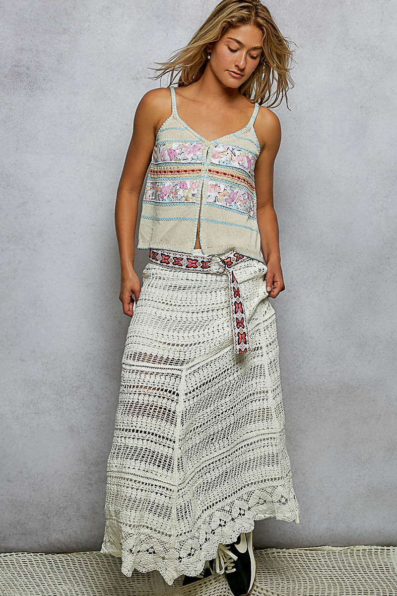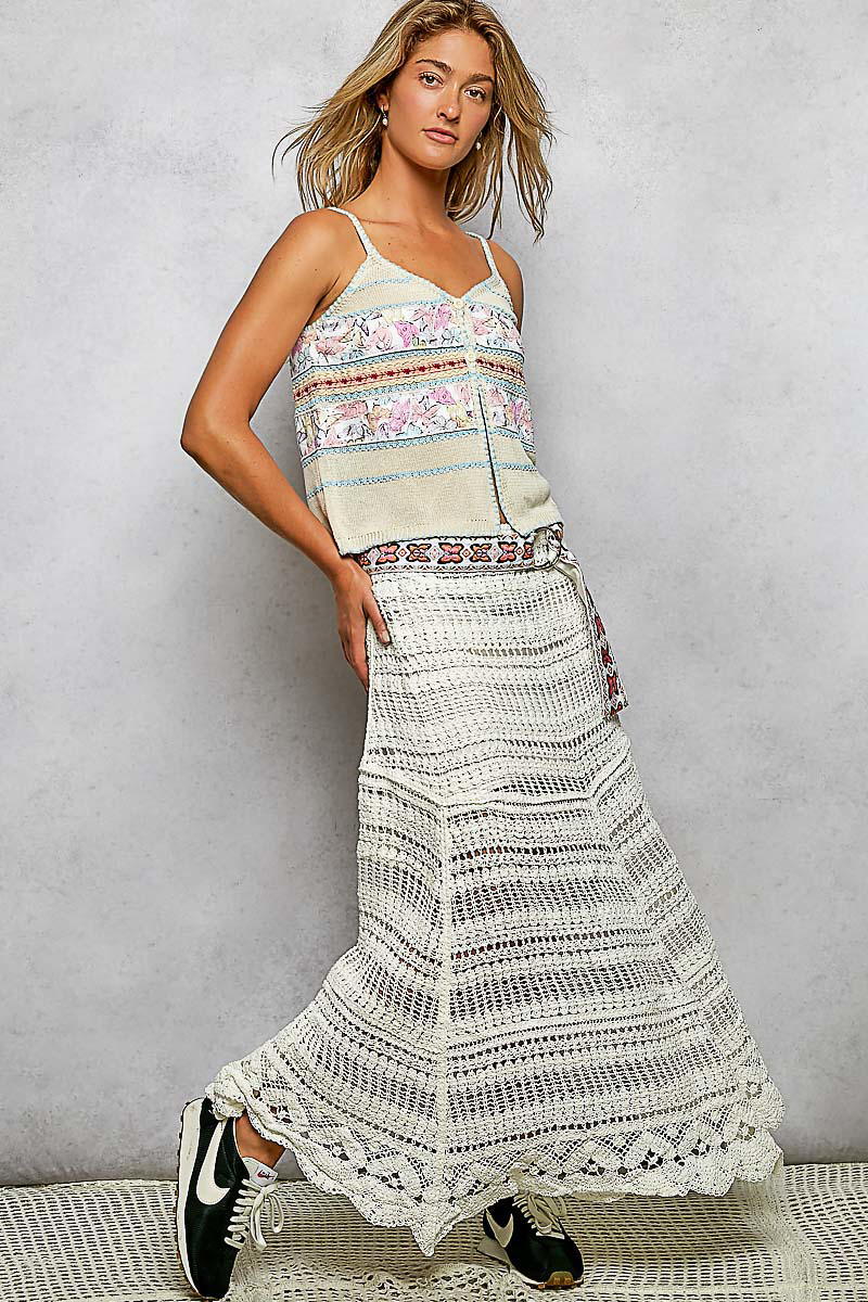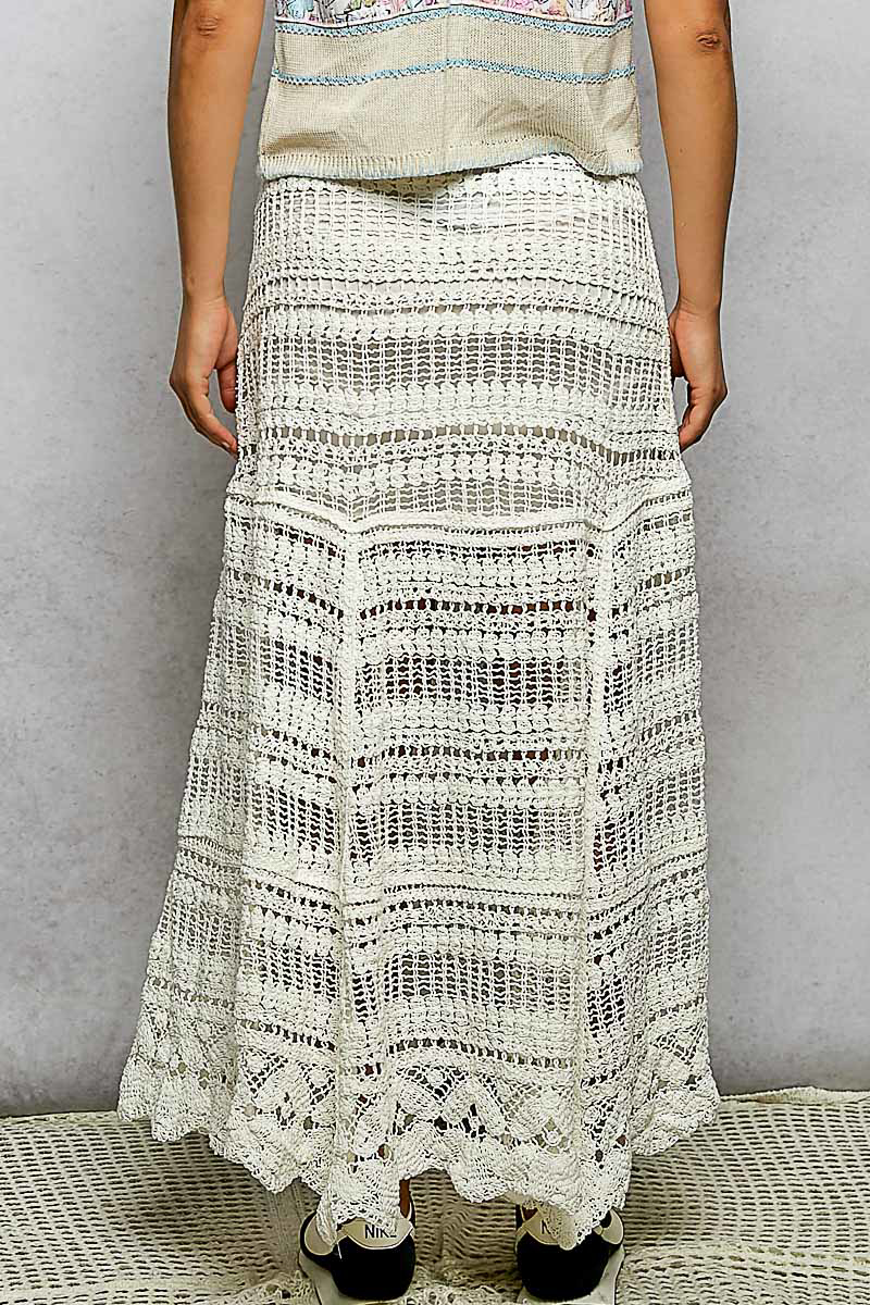 The roomy fit skirt in crochet with lining is a versatile and stylish piece that offers both comfort and charm. Crafted in crochet, this skirt features a delicate and intricate design that adds a touch of elegance to your outfit. The roomy fit provides ease of movement and a relaxed silhouette, perfect for everyday wear. With a lining for added coverage and comfort, this skirt is both practical and fashionable. Embrace the bohemian-inspired look of this crochet skirt and elevate your style with its unique texture and design.