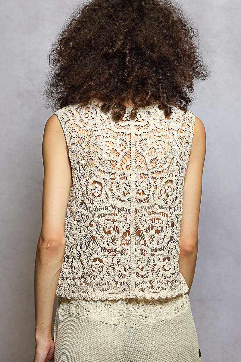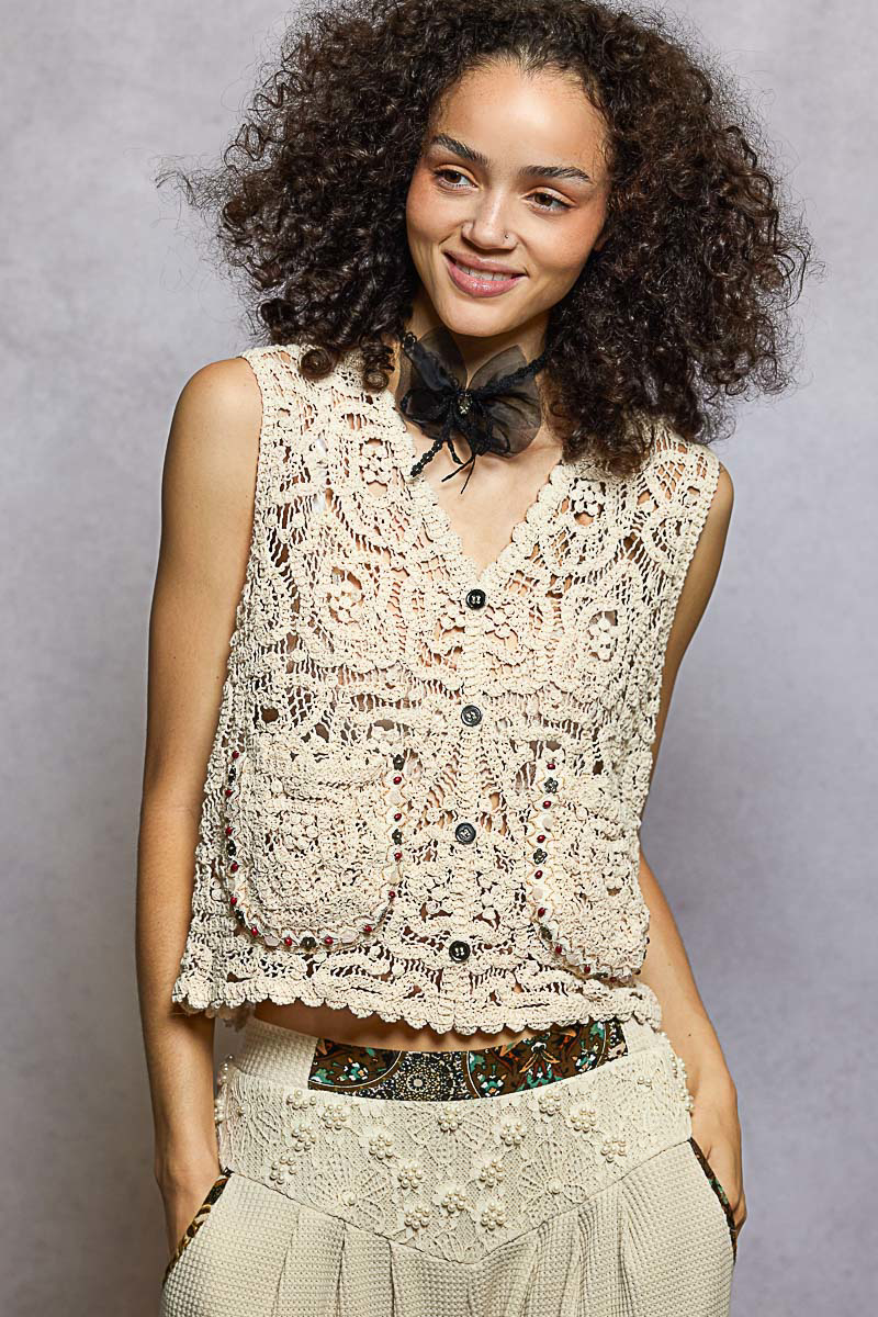 This V-neck sleeveless top features a relaxed fit crafted from crochet with beautiful varied patterns for a unique boho-inspired look. It is designed with dual patch pockets decorated with eye-catching studs and beads, adding a stylish decorative touch. The scalloped edge detailing enhances its delicate and feminine silhouette, elevating the overall design. A secure button closure ensures easy wearing and a neat finish. Made with breathable crochet fabric, it combines comfort and intricate detailing perfectly for casual everyday styling.