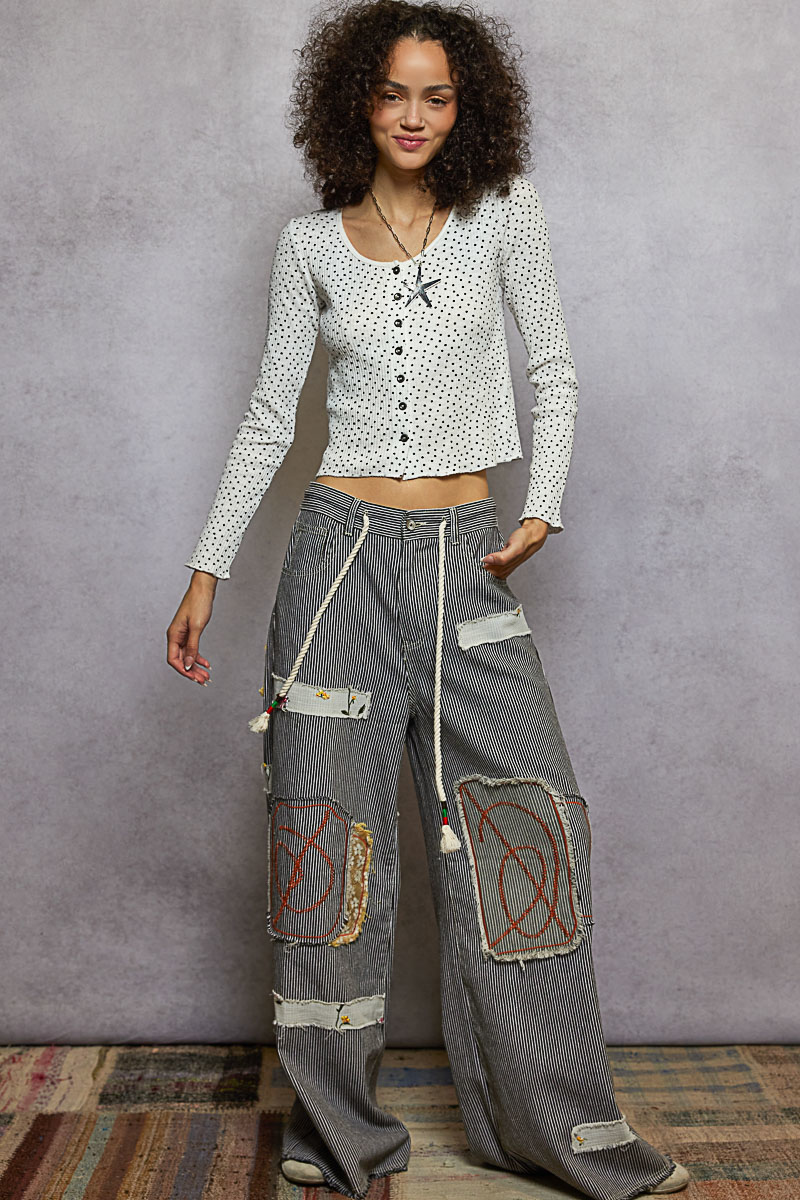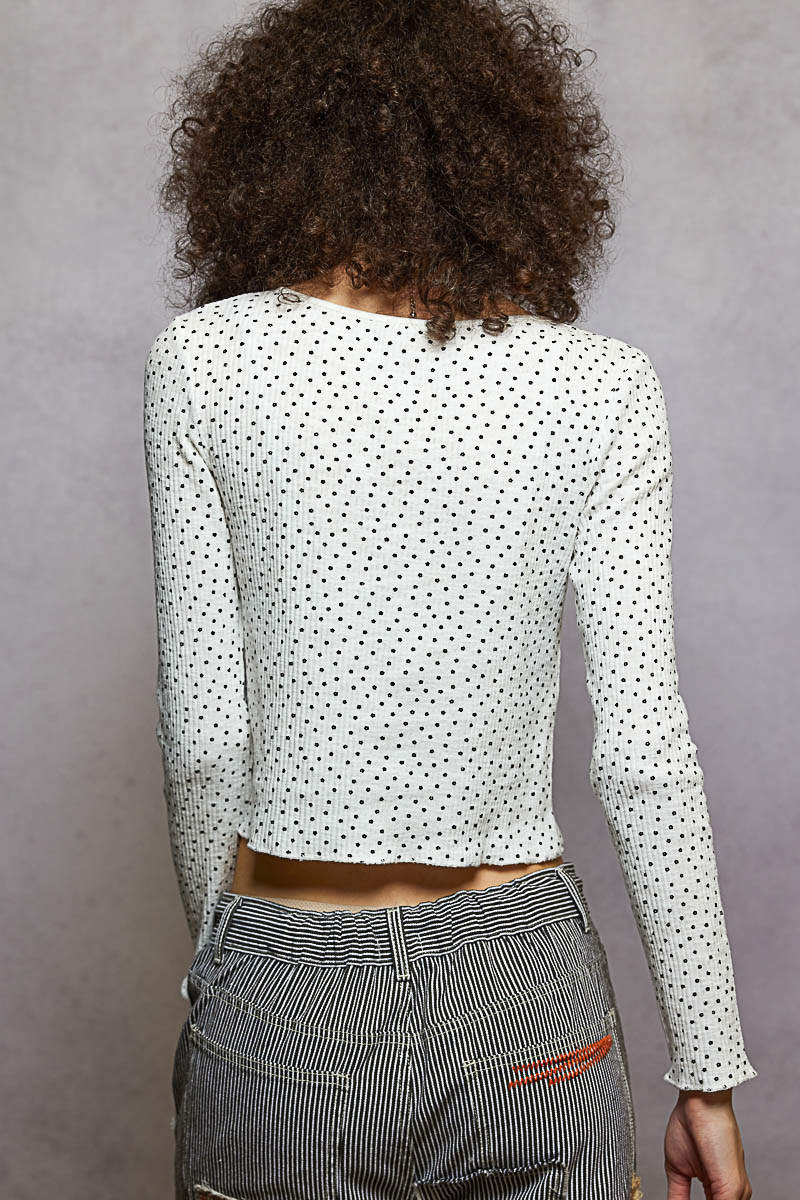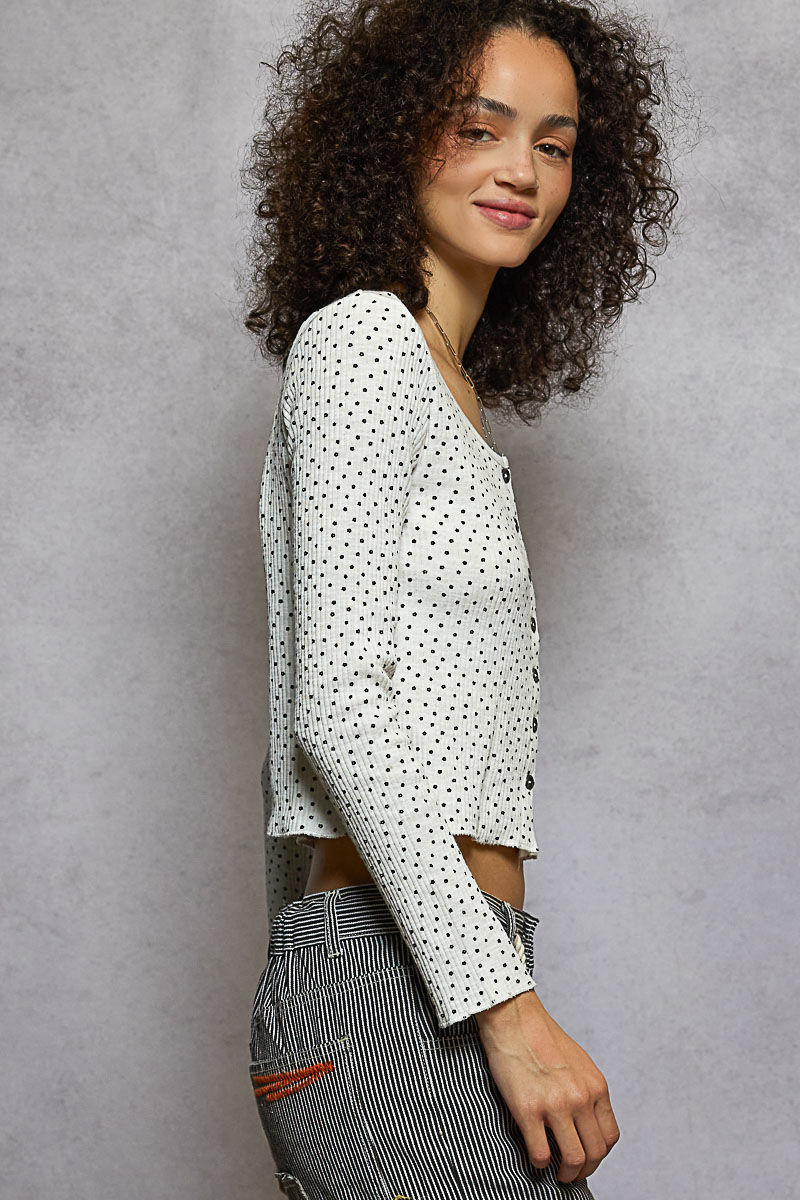 The button-down polka dot ribbed cardigan is a stylish and versatile addition to any wardrobe. With its classic polka dot pattern and cozy ribbed texture, it is perfect for layering during cooler weather. The button detailing adds a touch of sophistication, making it easy to dress up or down for any occasion. This cardigan is a great choice for adding a pop of pattern and texture to your outfit. Stay comfortable and chic in this trendy polka dot ribbed cardigan.