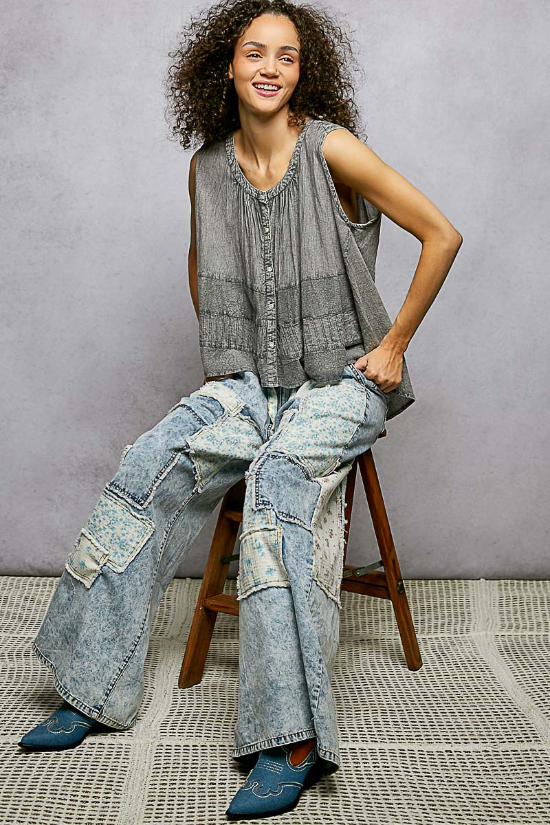 This sleeveless top features a round neck and relaxed fit, perfect for laid-back styling. Crafted in breathable cotton fabric, it offers comfort for everyday wear. The button-up detailing adds a touch of sophistication to the design. Enhanced with crochet contrast, this top exudes a bohemian charm. Versatile and stylish, it can be easily dressed up or down for various occasions.