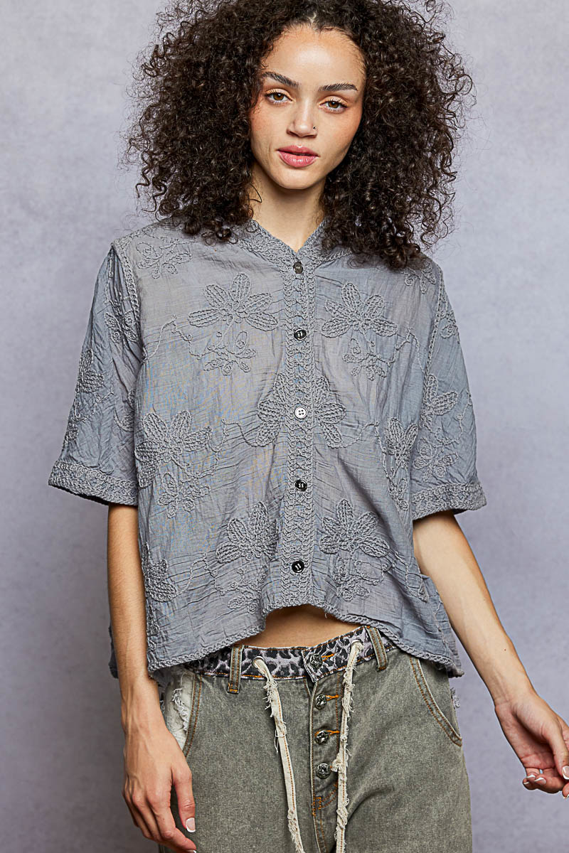 The lightweight woven crochet blouse showcases a breezy and relaxed silhouette with intricate floral stitching for a charming touch. It is designed with a button front closure, elbow-length sleeves, and subtle texture that adds depth to the overall look. Soft and breathable, this versatile top drapes comfortably and is perfect for everyday wear. Pair it effortlessly with relaxed bottoms for a casual and stylish ensemble. Whether styled with jeans for a laid-back outing or paired with linen trousers for a more polished look, this blouse offers both comfort and elegance in one chic piece.
