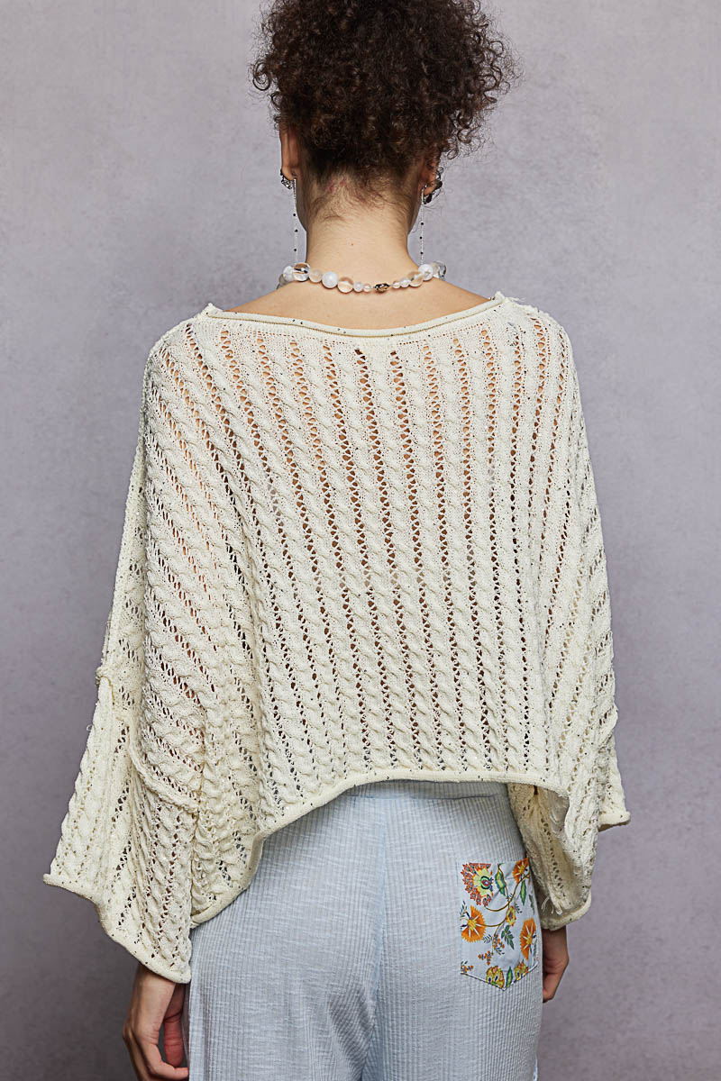 The round neck, 3/4 sleeve, cropped fit top is designed in acrylic sweater fabric with shiny detail in a pointed solid pattern. This trendy top offers a stylish and modern look. The cropped fit adds a flattering touch to the outfit. Perfect for adding a bit of sparkle to your wardrobe, this top is versatile and eye-catching. Elevate your ensemble with this chic and fashionable sweater top for a statement-making style.