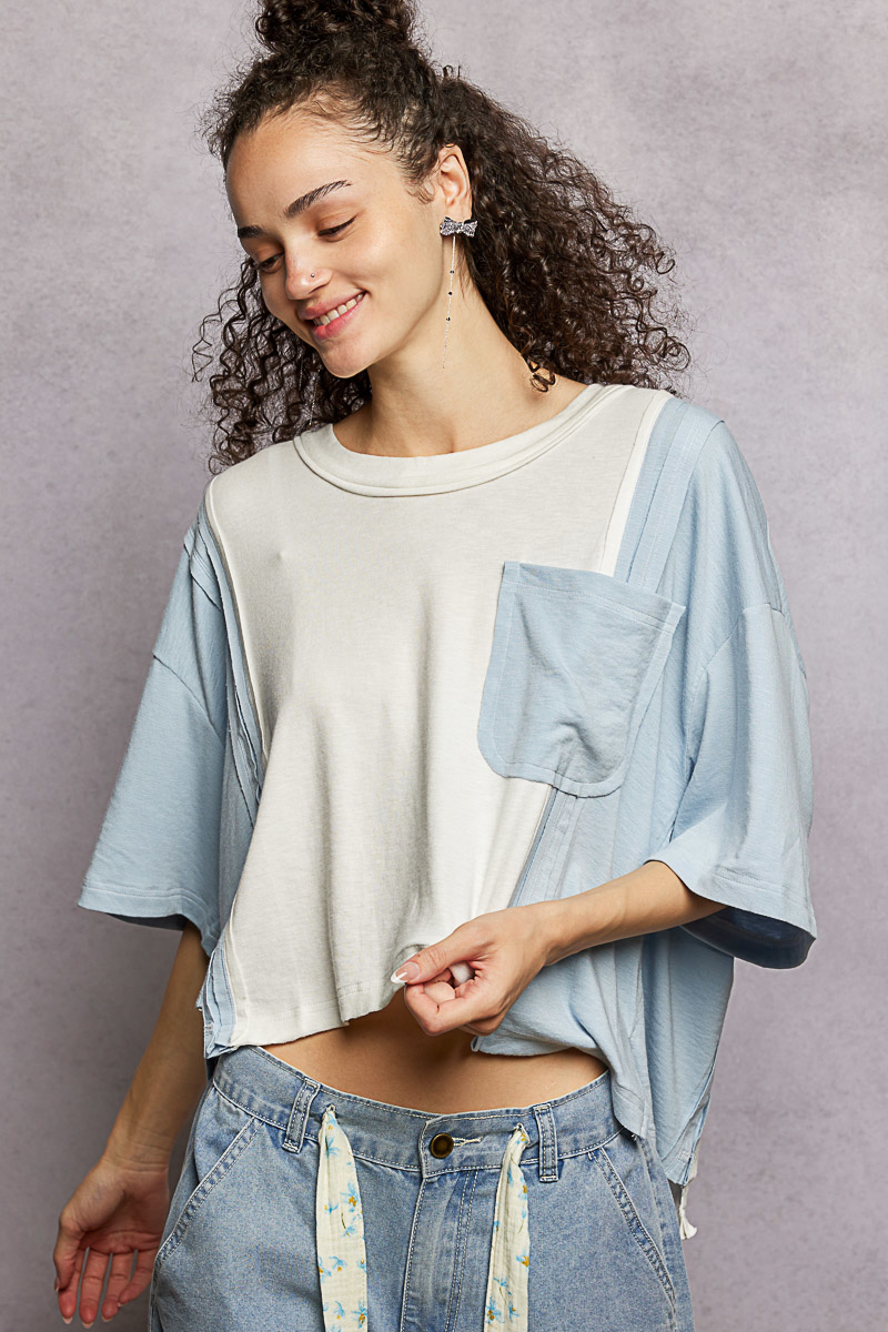 This round neck short sleeve shirt features a roomy, comfortable fit crafted from our signature ultra-soft, lightweight jersey fabric. It showcases modern deconstructed seams and bold color-blocked panels for a contemporary, edgy look. Designed with an asymmetrical hemline and a functional chest patch pocket, it blends unique detailing with everyday practicality. The soft jersey material ensures all-day comfort, making this shirt a stylish and versatile staple for casual wear.