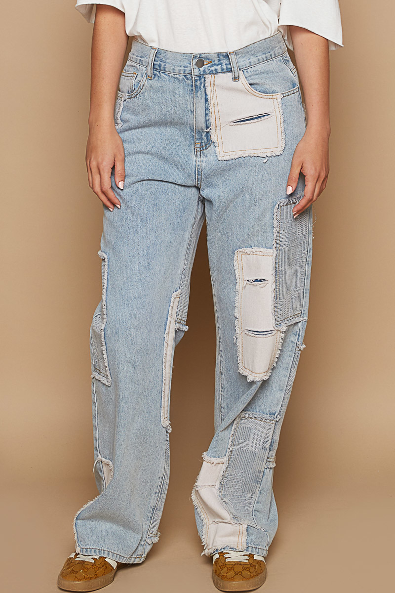 These fashion distressed boyfriend jeans feature a relaxed fit with extensive ripping and patchwork white fabric details throughout. Made from comfortable cotton denim in a light blue wash, they showcase a vintage-inspired design with frayed edges and raw hems. The high-waisted silhouette offers both style and comfort, while the heavily distressed elements create a bold streetwear statement. Perfect for casual outings, these jeans combine edgy aesthetic with comfortable wearability, featuring classic five-pocket styling and durable construction despite the intentional distressing.