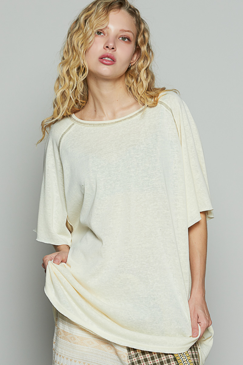 This oversized cream T-shirt features a relaxed loose fit design with distinctive flutter sleeves that create a modern casual silhouette. Made from soft breathable cotton blend fabric, it offers superior comfort for all-day wear. The round neckline and dropped shoulder construction provide a contemporary oversized aesthetic. The cream color adds versatility to any wardrobe, making it perfect for layering or standalone wear. The lightweight material ensures breathability while maintaining durability. Ideal for casual outings, weekend wear, or as a comfortable loungewear piece.