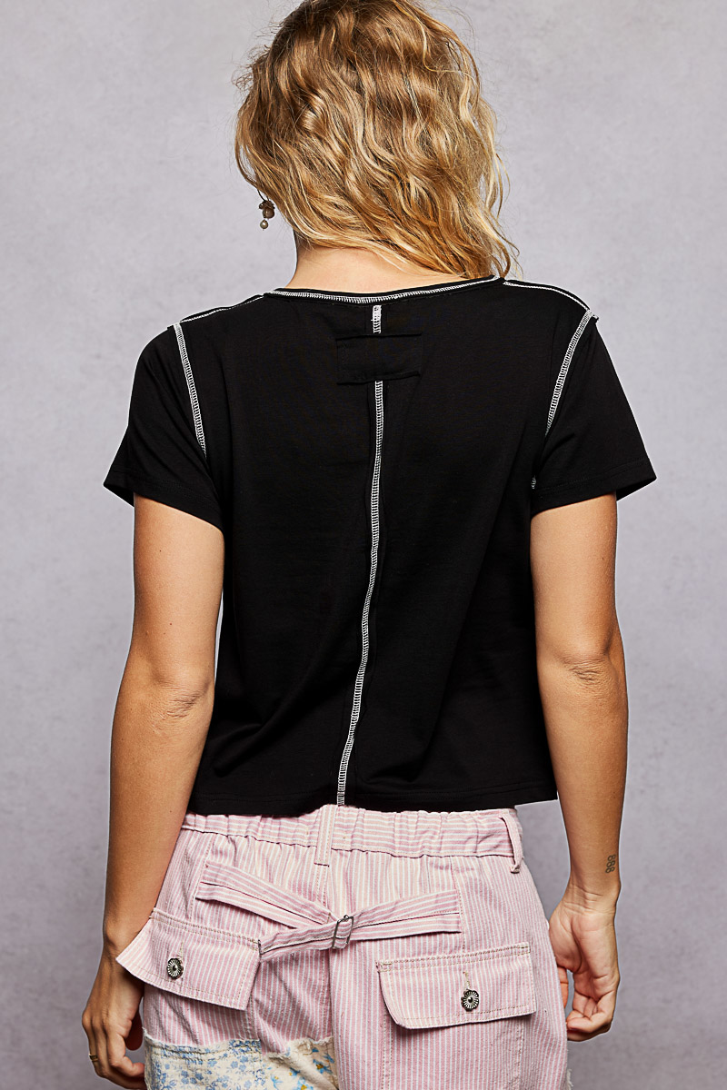This classic black crop T-shirt is a wardrobe essential. Made from soft and breathable cotton, it offers all-day comfort. The cropped length is perfect for pairing with high-waisted jeans, skirts, or shorts. The contrast stitching detail adds a touch of uniqueness to this versatile piece. Its durable construction ensures long-lasting wear, and it's easy to care for with machine washable fabric. Ideal for creating a variety of stylish outfits, this T-shirt is a must-have for any fashion-conscious individual.