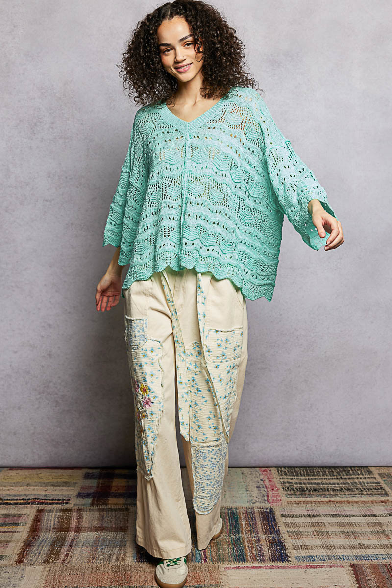 This oversized fit sweater top is designed with dropped shoulders and a V-neck for a relaxed and casual look. The 3/4 sleeves add a stylish touch to the design. Made of thin and lightweight acrylic material, perfect for layering or wearing on its own. The oversized fit provides comfort and a trendy silhouette. Elevate your outfit with this chic and versatile dropped shoulder sweater top that offers a modern and laid-back style.