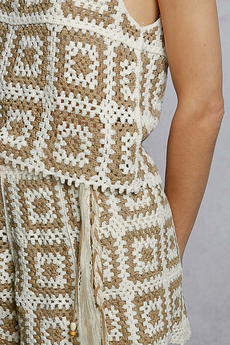 These relaxed fit crochet shorts feature a charming granny square weave pattern that exudes bohemian flair. The elastic waistband ensures a comfortable and customizable fit for all-day wear. The clean finish lends a polished and sophisticated touch to the overall design. Perfect for warm weather days, these shorts can be styled casually or dressed up for a trendy look. Embrace the artful craftsmanship of these crochet shorts for a stylish and unique addition to your summer wardrobe.