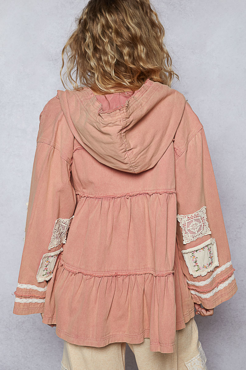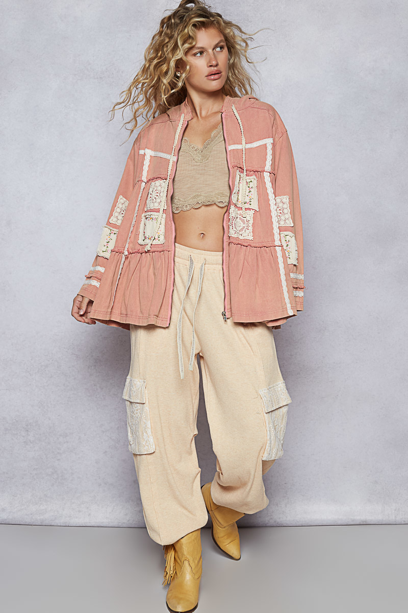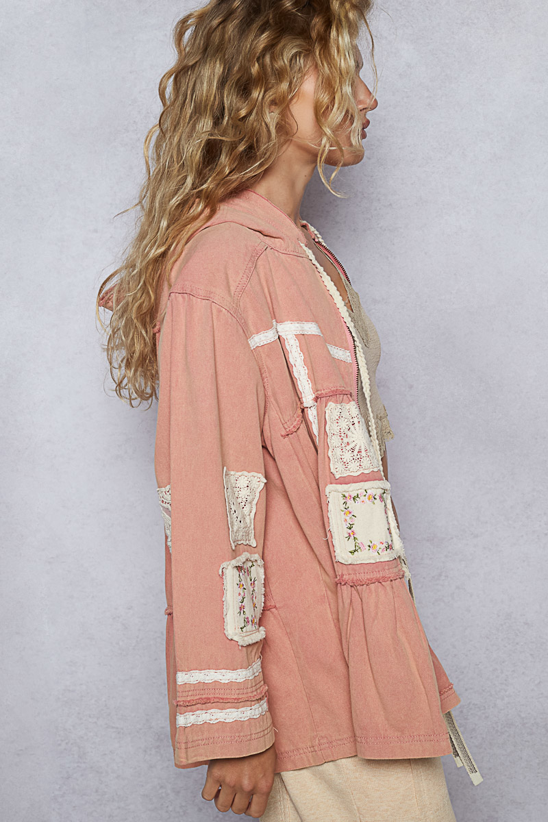This hoodie jacket top is designed with three-quarter sleeves and a flared body for a stylish and comfortable fit. Made from twill fabric, it features unique details such as out seams, patch points, and trim points for added interest. The embroidered patches and edge cuts enhance the jacket's edgy and modern aesthetic. With vintage washing and a solid color, this jacket exudes a trendy and urban vibe. Stand out from the crowd with this unconventional and fashion-forward piece!