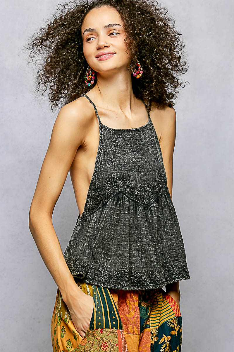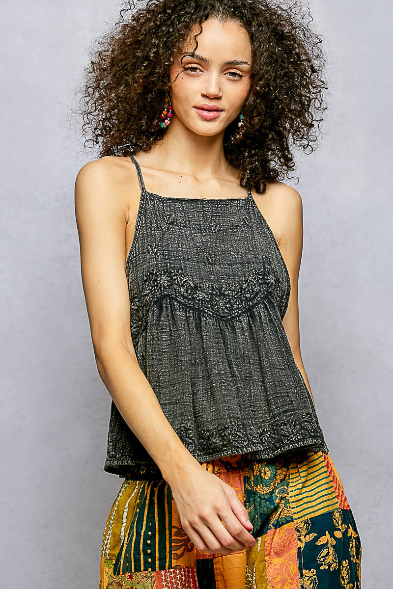 Sleeveless embroidered Cami top crafted from lightweight woven fabric with a softly textured finish. Designed with a square neckline and delicate adjustable shoulder straps, these top features intricate floral embroidery across the bodice and along the hem for added dimension. A gently gathered empire seam creates a relaxed, flowy silhouette that drapes naturally over the body. Finished with subtle lace trim accents, these versatile top offers breathable comfort and refined detail, perfect for warm-weather wear or effortless layering.