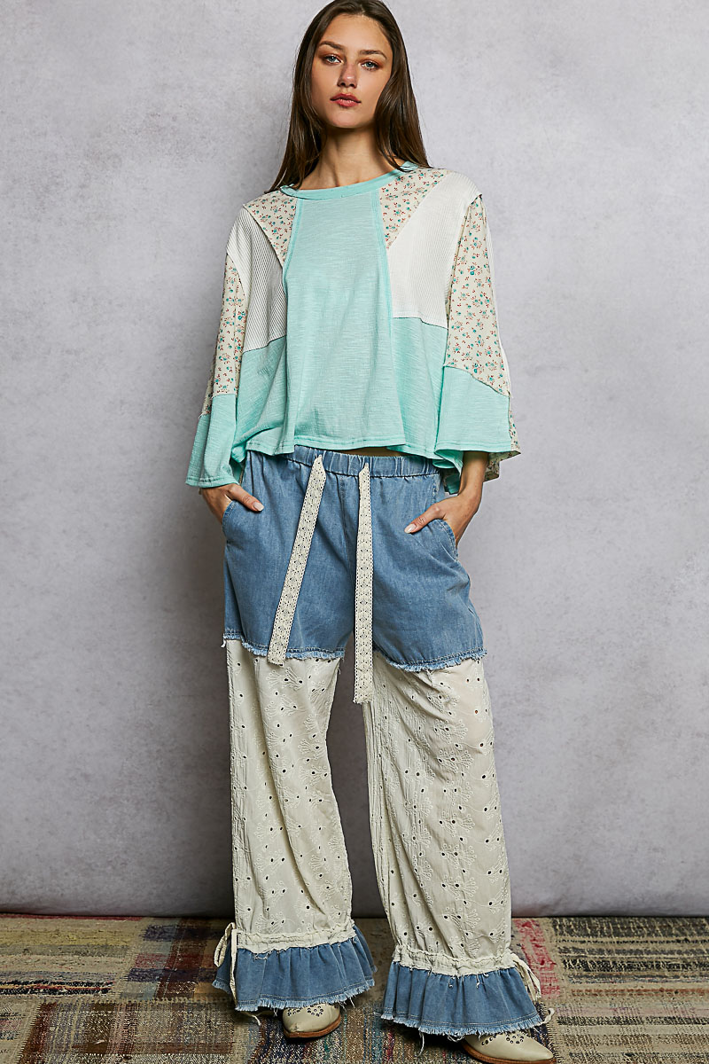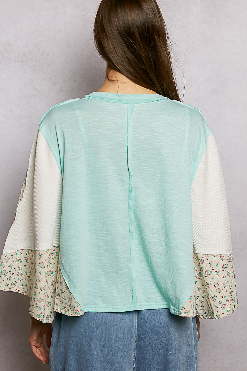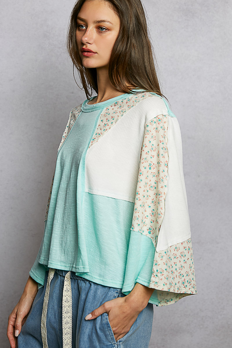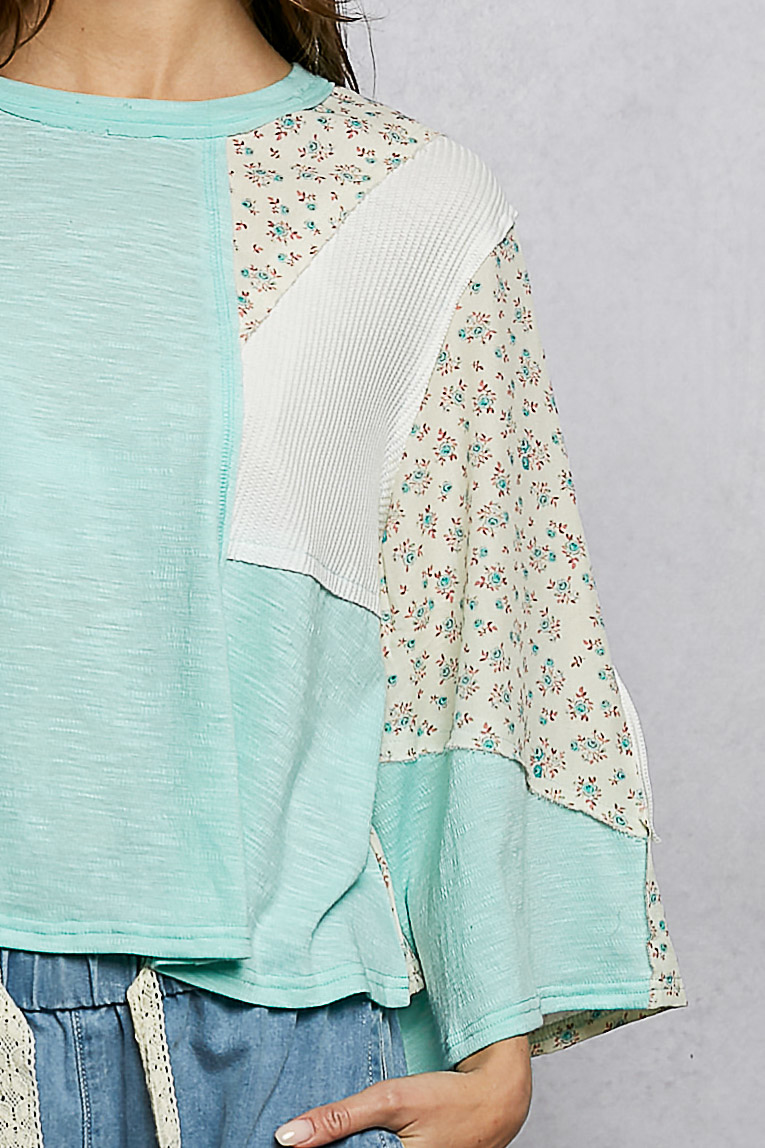This relaxed fit top, featuring a classic round neck and 3/4 length sleeves, is crafted from a textured slub knit that offers a natural, heathered appearance. The design is centered around a vibrant color contrast that highlights the intricate floral patterns, creating a clear focal point against the solid base. By integrating the organic feel of the slub fabric with these pointed decorative elements, the piece achieves a balanced aesthetic that focuses on clean lines and artisanal print details.