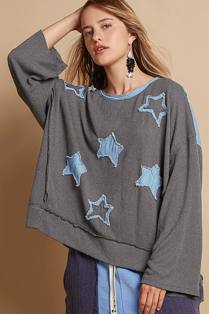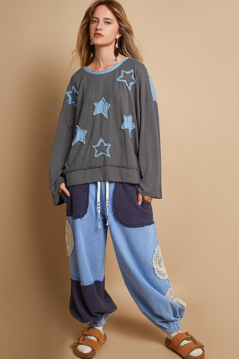 This relaxed fit sweater features exposed seams and a unique star denim patch for a trendy look. Perfect for a casual and laid-back style with a touch of edge. The exposed seams add a cool and modern twist to this classic piece. Pair it with your favorite jeans for a comfortable and stylish outfit. Embrace the effortless charm of this sweater for a versatile addition to your wardrobe.