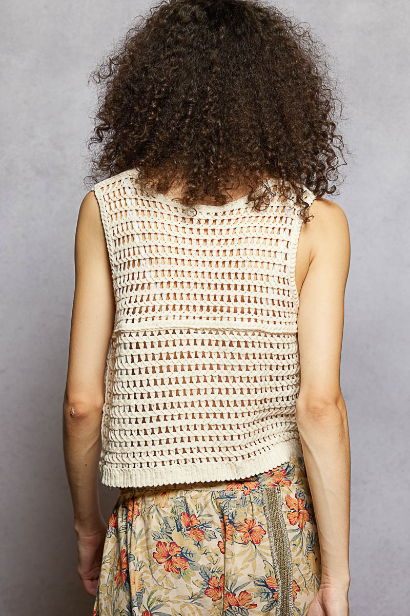 This sleeveless V-neck vest showcases a regular fit and intricate crochet construction with varied patterns. The addition of floral embroidery and border accents enhances the vest's unique and stylish appearance. The combination of different textures and designs creates a dynamic and eye-catching look. Perfect for layering over tops or dresses, this versatile piece adds a touch of bohemian charm to any outfit. Elevate your wardrobe with this beautifully crafted vest that exudes a sense of artistry and flair.