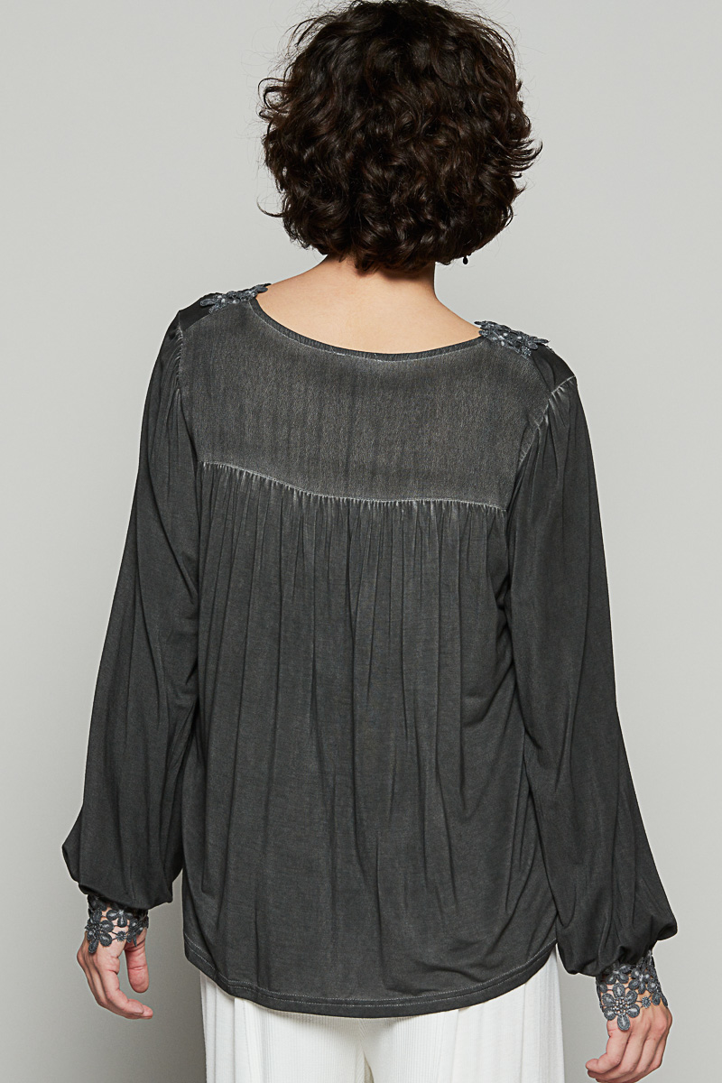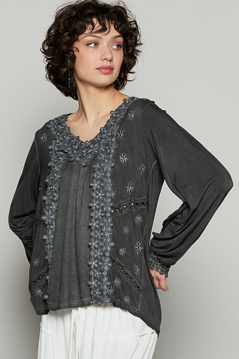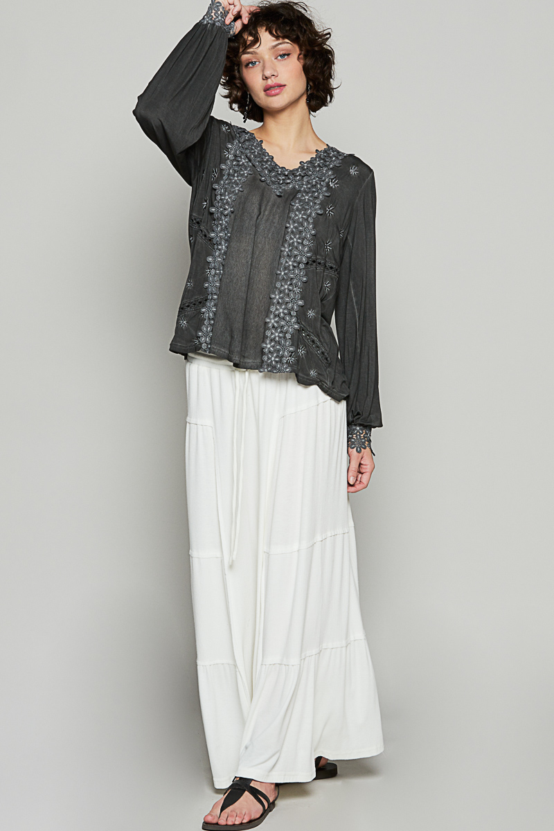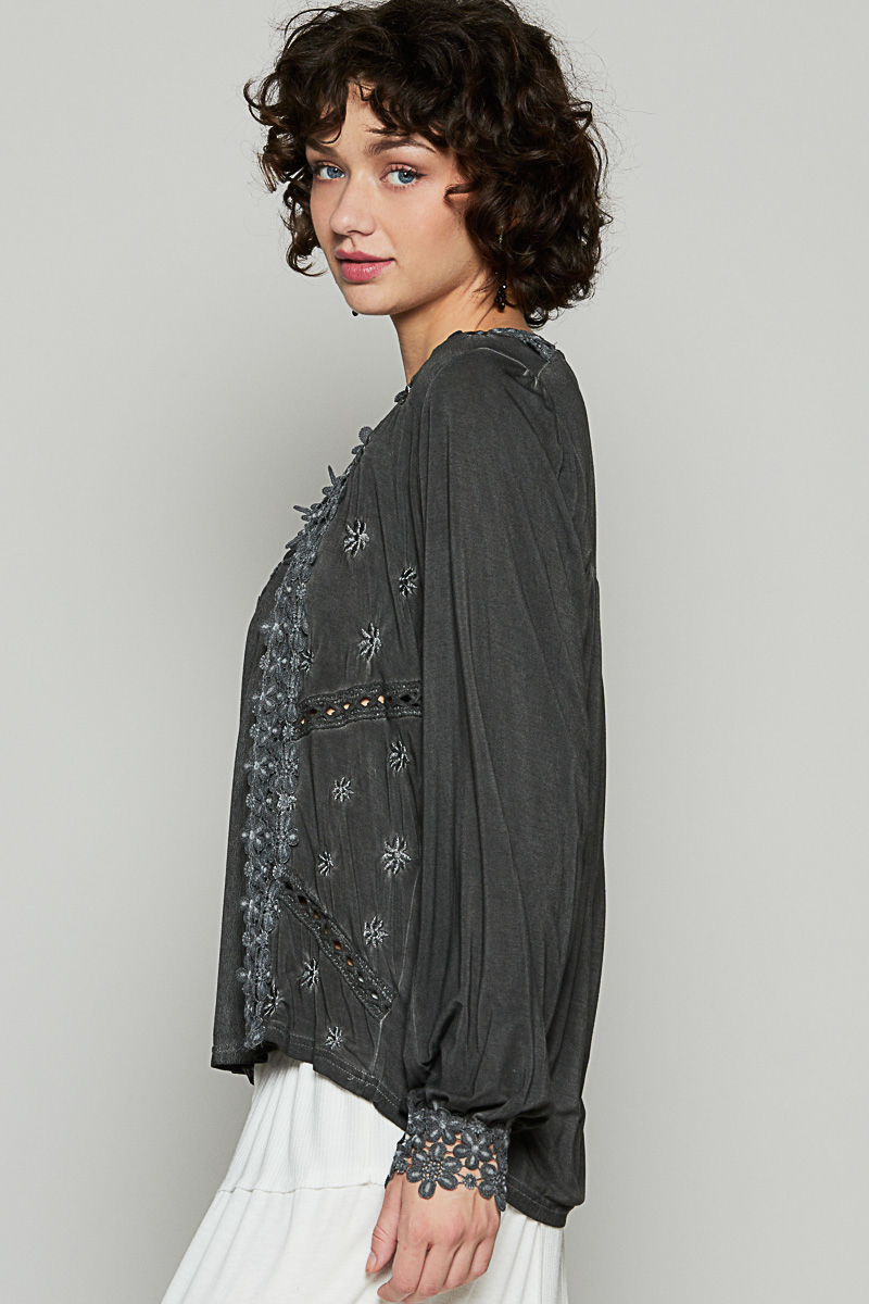 The Floral Embroidery Woven Top offers a relaxed fit and delicate floral lace trim along the low V neckline. Floral embroidery detailing on the side front adds a charming touch to the design. The back features see-through lace shirring below the yoke to provide a roomy fit. This top is elegantly finished with clean hems for a polished look. Complete with shirred long sleeves and scallop floral trim with side button closure, this top exudes feminine charm and sophistication.