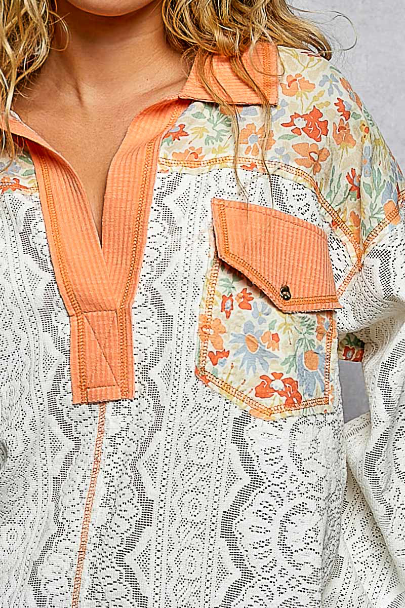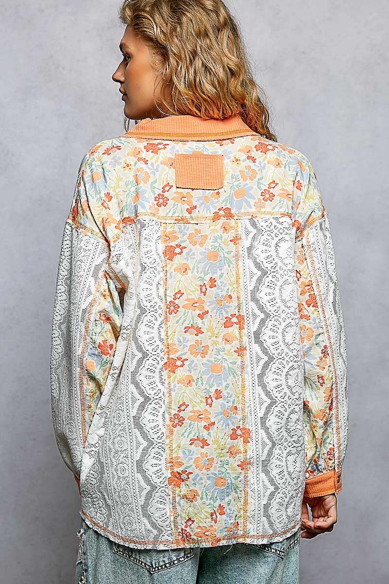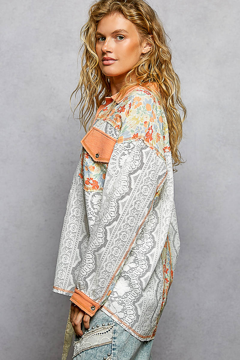 POL Floral Print Long Sleeve Lace Shirt with Front Pocket