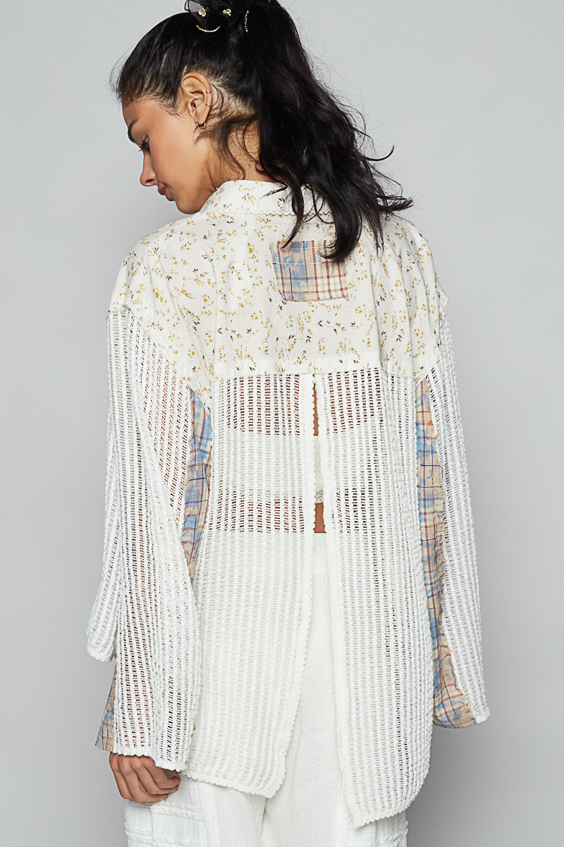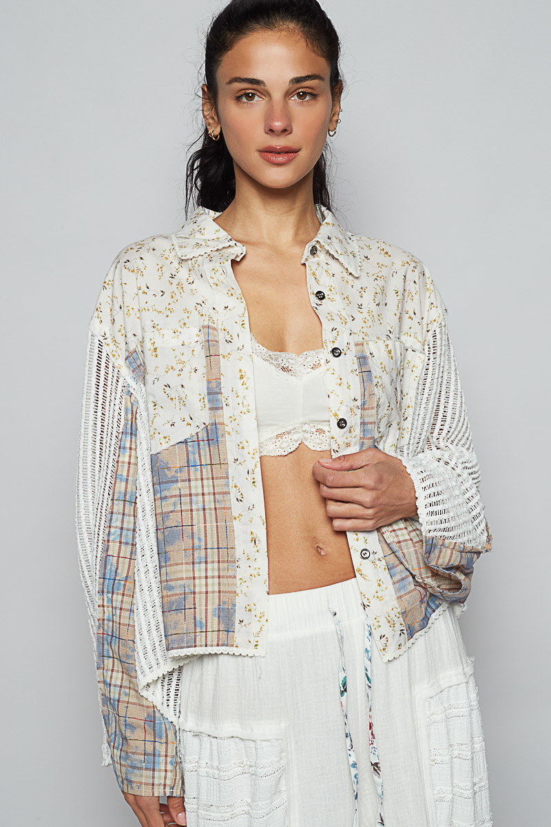 This oversized patchwork print shirt features a unique mixed-pattern design combining floral, plaid, and geometric prints. Made from lightweight, breathable fabric blend that ensures comfort throughout the day. The relaxed oversized fit provides a contemporary streetwear aesthetic while maintaining versatility for layering. Classic button-down construction with pointed collar offers timeless appeal. Perfect for casual styling or as a statement layering piece. The diverse print combination adds visual interest and modern flair to any wardrobe.