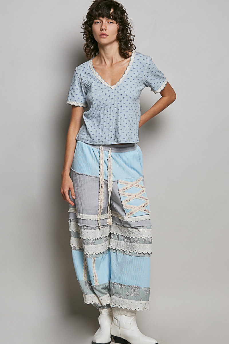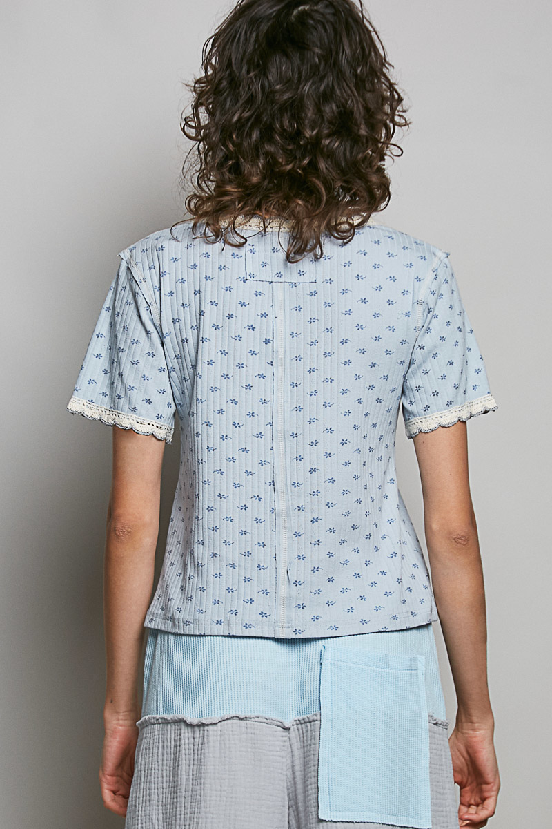 This V-neck short sleeve top has a regular fit made of stretchy ribbed fabric for all-day comfort. It features a clean V-neckline and pointed trim at the sleeve openings for a subtle stylish detail. Treated with vintage washing, it offers a soft, worn-in feel and retro charm. Adorned with a delicate floral pattern, it adds a romantic touch to the simple silhouette. Versatile and easy to match, it’s ideal for everyday casual wear.