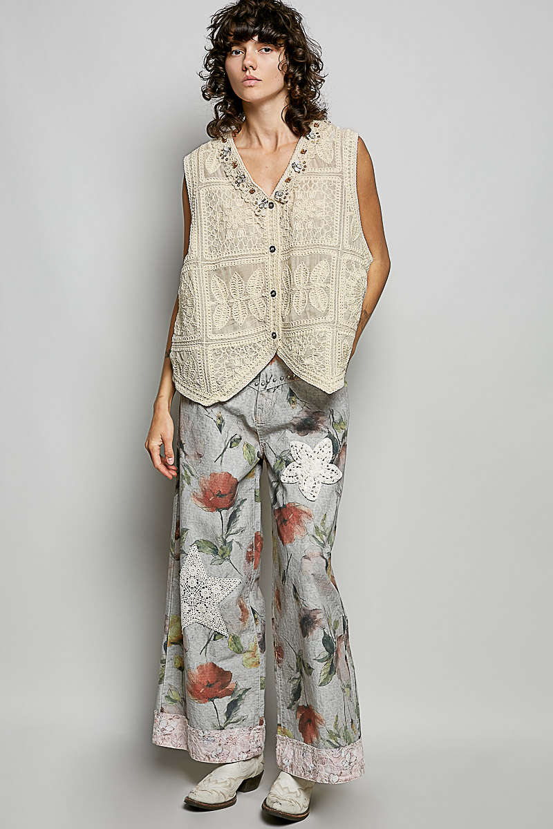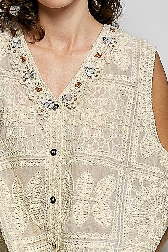 This V‑neck vest is designed with a roomy, comfortable fit, showcasing intricate crochet construction enhanced with fine couching cord work, delicate lace trim, and subtle embellishments for artisanal texture and elegant detail.