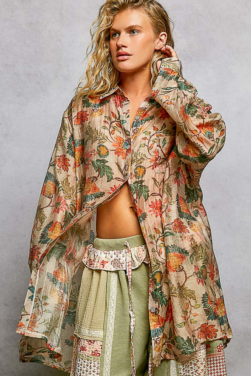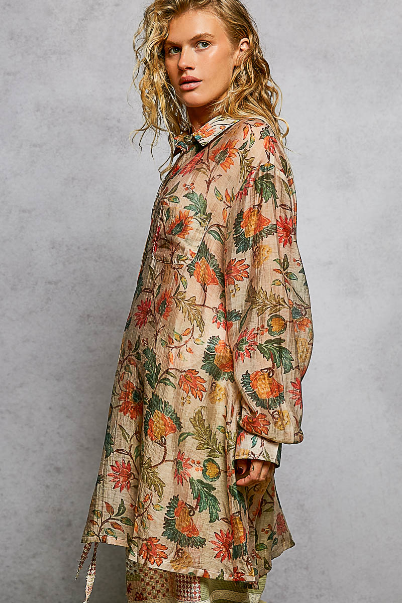 This roomy fit shirt top showcases a stylish woven print with a vibrant floral pattern for a chic and feminine look. The metal button-down front adds a touch of sophistication to the design. A convenient front pocket enhances functionality while adding a trendy detail. The normal washing process ensures easy care and maintenance of the top. Embrace the charm of the floral pattern and versatile styling options with this fashionable and comfortable shirt top.