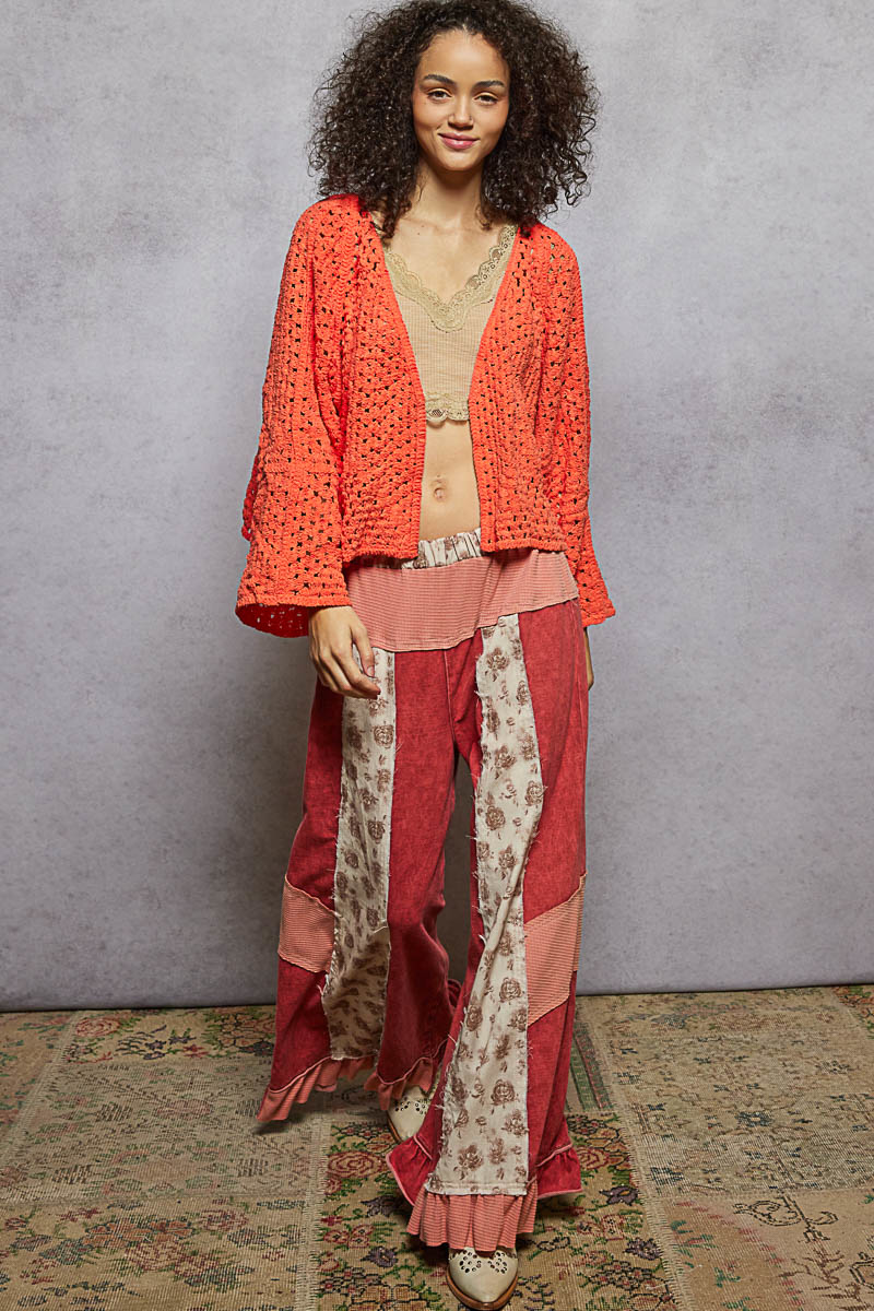 This open front cardigan showcases beautiful crochet patterns for a unique and charming style. The intricate detailing adds a touch of elegance to the design. Perfect for layering over a basic top or dress, this cardigan is a versatile wardrobe staple. The crochet work creates a lovely texture that elevates the overall look of the cardigan. Stay cozy and chic with this fashionable piece in your collection.