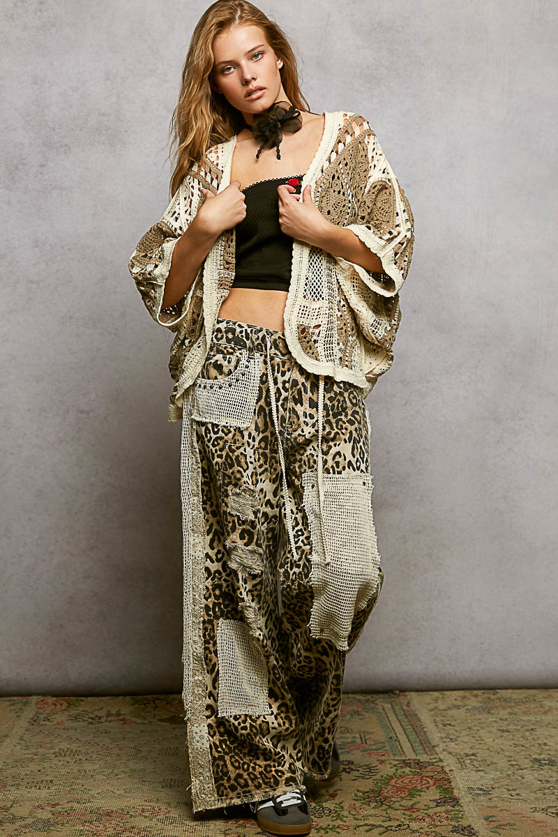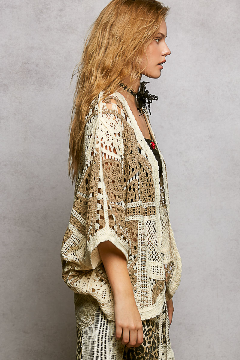 This open cardigan is designed with 3/4 batwing sleeves and a roomy fit, featuring intricate crochet work with a variety of weave patterns that create a visually appealing texture. The scalloped edge adds a touch of elegance and detail to the overall design. Perfect for layering over any outfit, this cardigan offers a bohemian-chic vibe that exudes effortless style. Embrace the unique craftsmanship and attention to detail in the crochet work of this cardigan for a standout look. Elevate your wardrobe with this statement piece that combines comfort and fashion in one.