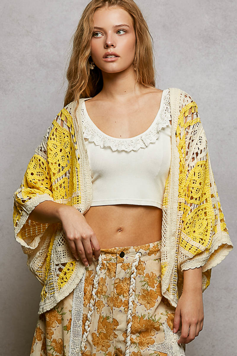 This open cardigan is designed with 3/4 batwing sleeves and a roomy fit, featuring intricate crochet work with a variety of weave patterns that create a visually appealing texture. The scalloped edge adds a touch of elegance and detail to the overall design. Perfect for layering over any outfit, this cardigan offers a bohemian-chic vibe that exudes effortless style. Embrace the unique craftsmanship and attention to detail in the crochet work of this cardigan for a standout look. Elevate your wardrobe with this statement piece that combines comfort and fashion in one.
