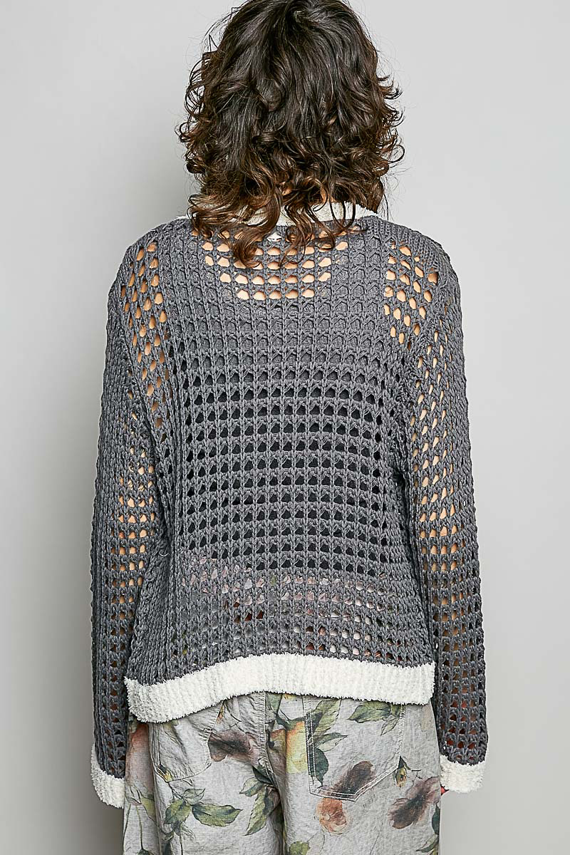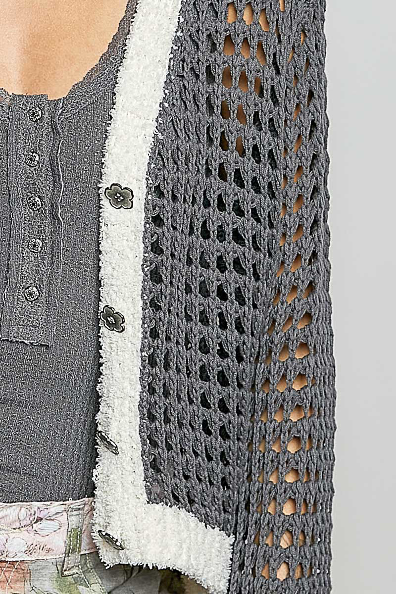 This V-neck long sleeve cardigan sweater features a regular fit and soft cotton fabric for all-day comfort. It showcases a stylish berber neck with a structured placket and clean band detailing for a polished finish. Adorned with floral metal buttons down the front, it adds a delicate, eye-catching accent to the solid-color design. The classic V-neck and long sleeves make it ideal for layering over any casual or dressy outfit. With its timeless silhouette and thoughtful details, this cardigan blends versatility, comfort, and feminine charm seamlessly.