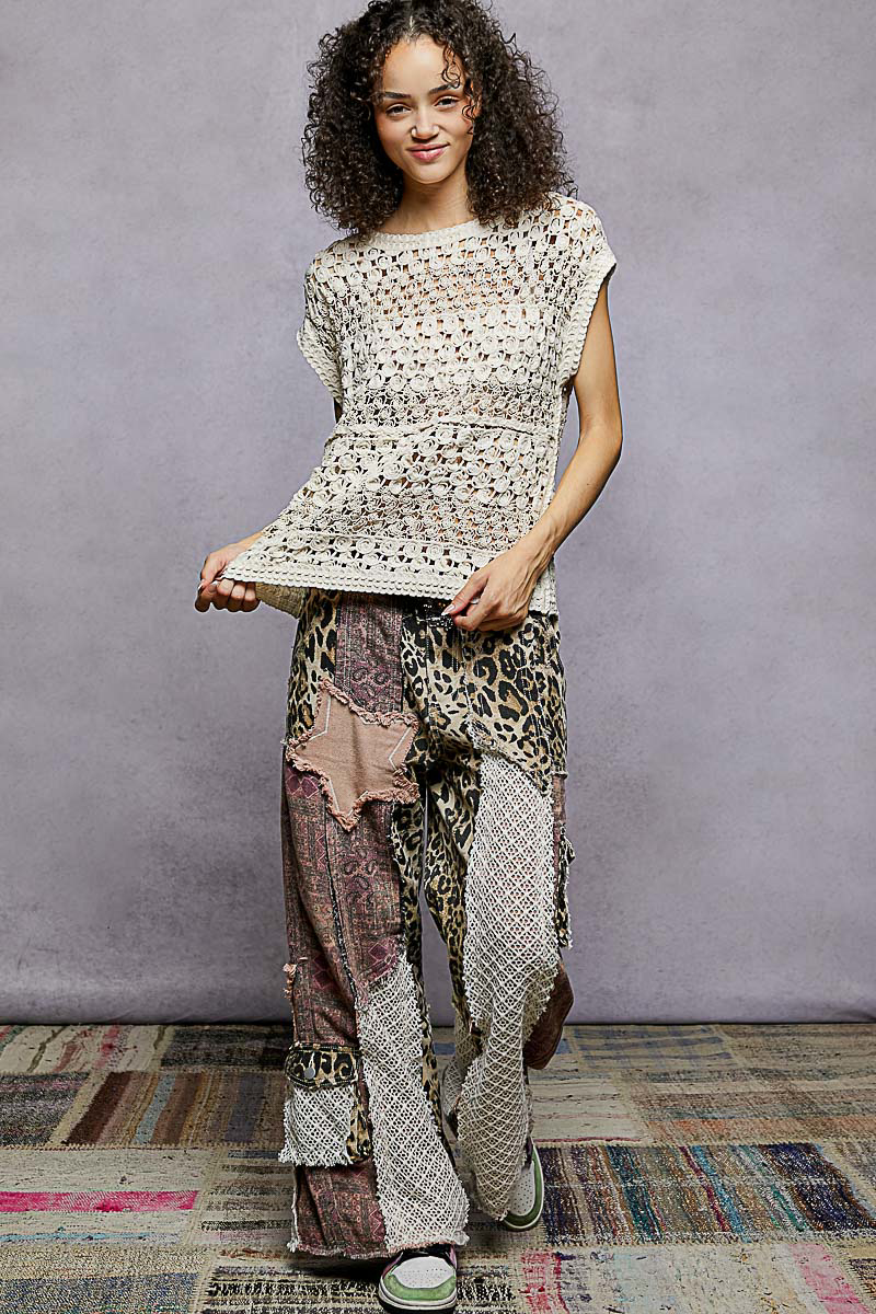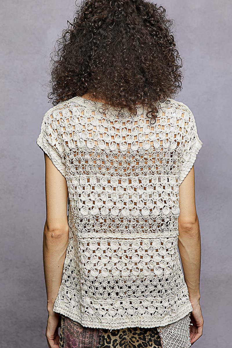 This round neck sleeveless top features a relaxed fit and intricate crochet with varied patterns. It is accented with delicate border trims and subtle striped details for a stylish touch. The breathable crochet construction ensures comfort and a lightweight, breezy feel. Its timeless design makes it easy to pair with bottoms for effortless everyday wear.