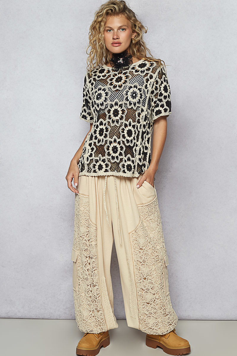 Elevate your summer wardrobe with this openwork short sleeve crochet knit top showcasing intricate weave knit patterns. The crochet details add a charming and bohemian flair to the top. The short sleeves provide a breezy and stylish look for warm days. Perfect for pairing with high-waisted bottoms for a trendy and feminine ensemble. Stay on-trend and effortlessly chic with this unique crochet knit top.