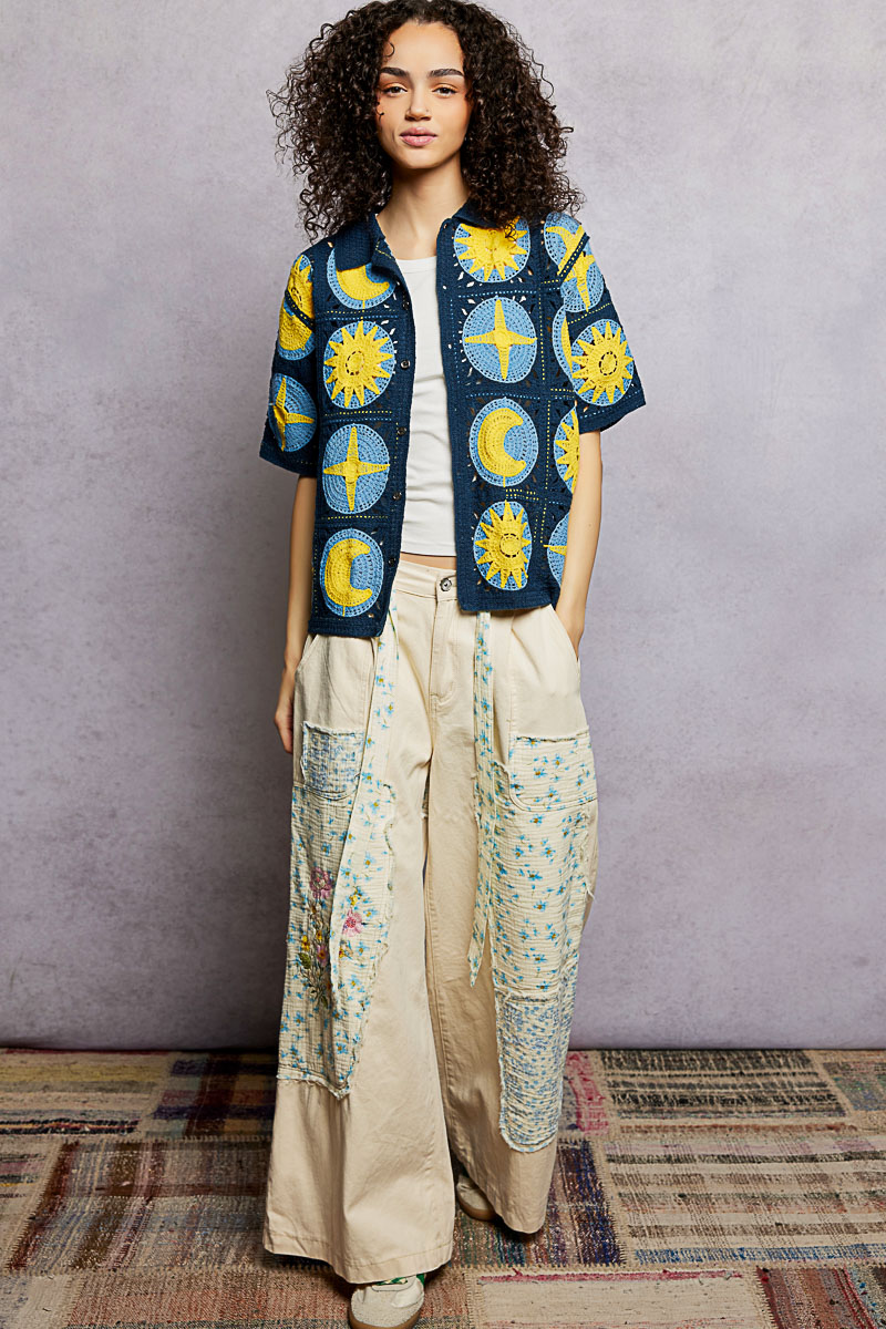 This short-sleeve regular-fit shirt top is crafted in crochet, providing a delicate and textured appearance. It showcases metal button-down detailing for a touch of elegance. The unique star-and-moon pattern adds a playful and whimsical charm to the design, making it a standout piece in any wardrobe.