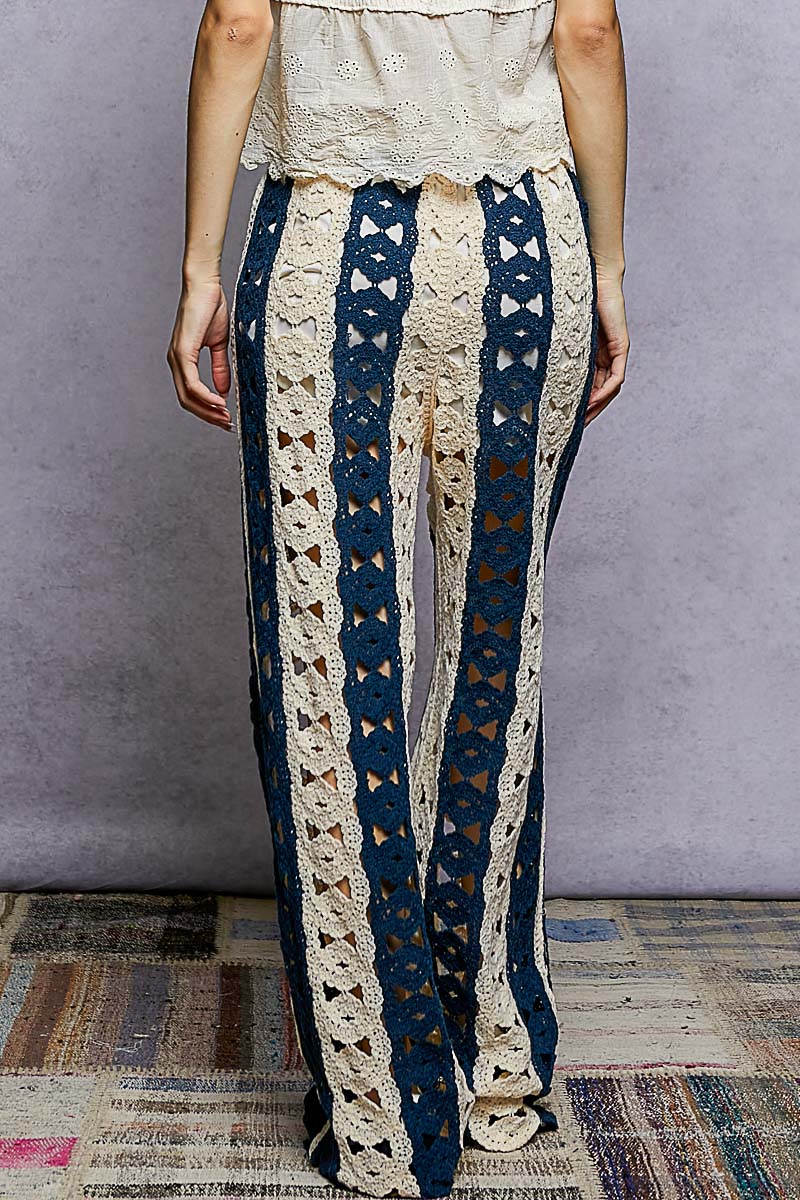 Elevate your summer style with these wide-leg crochet pants featuring varied patterns and stripe detail. The elasticized waistband ensures a comfortable and flattering fit. Perfect for a bohemian-inspired look, these pants are designed to make a statement. Pair them with a simple top and sandals for a laid-back yet fashionable outfit. Enjoy the airy and breezy feel of these unique pants for any warm-weather occasion.