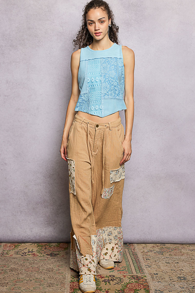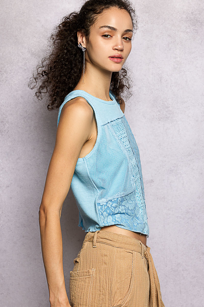 This top is designed with a round neck and sleeveless cropped fit. It features a ribbed texture with panel detail for added style. The pointed solid pattern adds a unique touch to the overall design. This top is perfect for a casual yet trendy look. Pair it with high-waisted pants or a skirt for a fashionable outfit.
