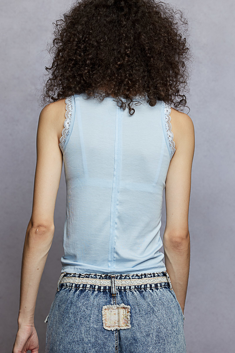This top features a round neck and a fitted sleeveless silhouette, made from comfortable jersey fabric. It is adorned with elegant lace trim details. The design offers a sleek and flattering fit. Perfect for layering or wearing on its own, this top is versatile for various occasions.