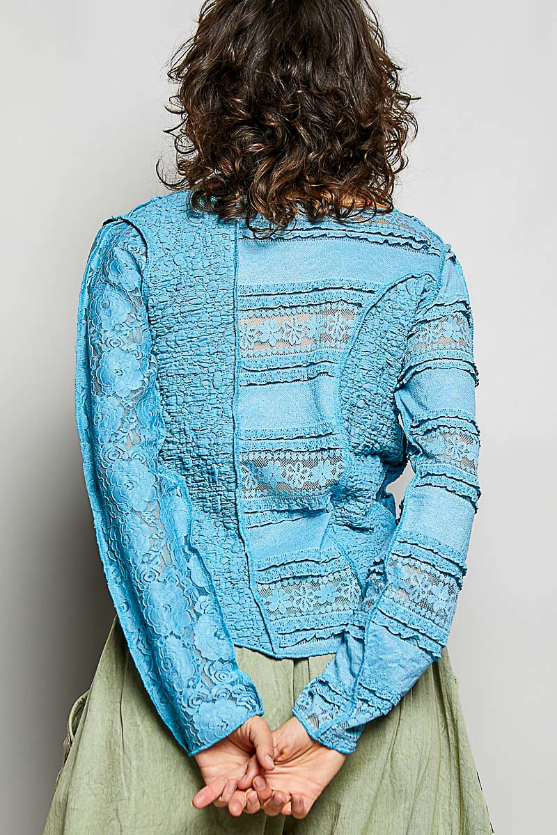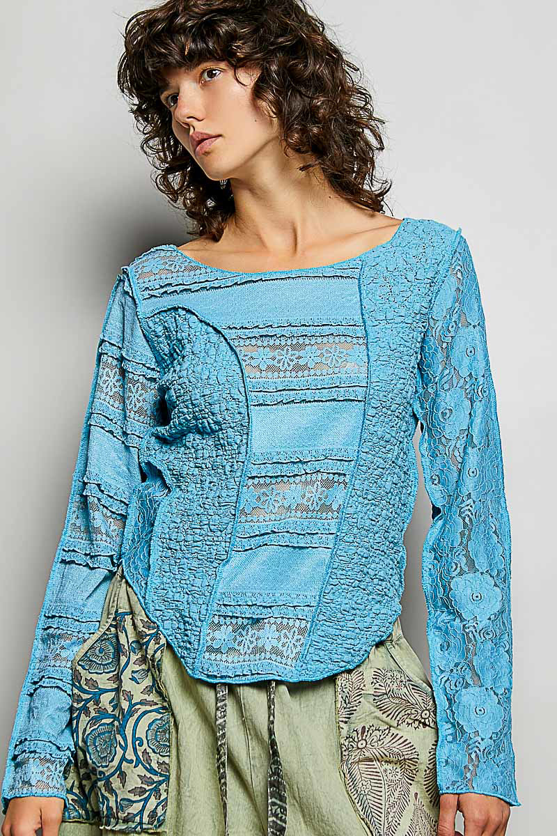 The round-neck long-sleeve slim-fit top crafted in lace is a sophisticated and elegant choice for any occasion. With its patch detail, outseam accents, and high-low hem, this top offers a modern and stylish twist on a classic design. The solid color adds a touch of versatility, allowing you to easily pair it with different bottoms. Add texture and sophistication to your outfit with this beautifully crafted lace top. Make a fashion statement with this chic and unique piece that exudes elegance and charm.