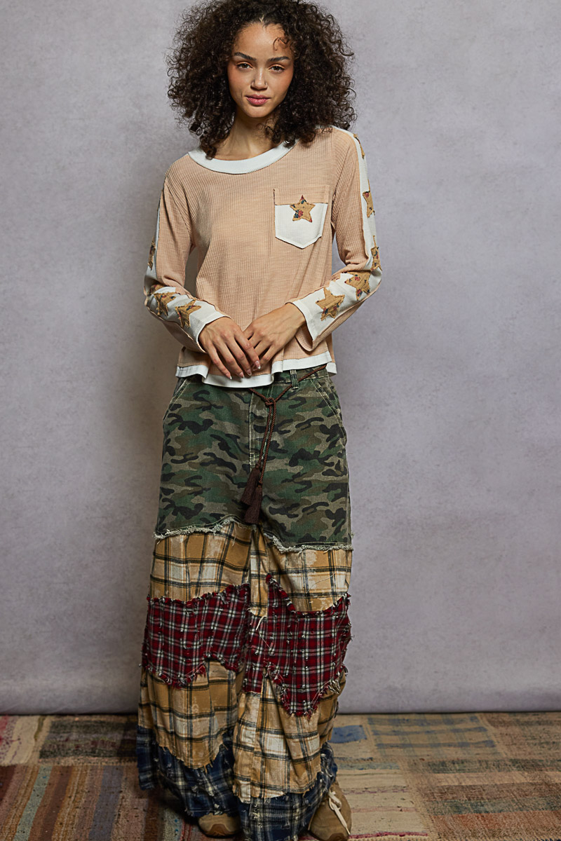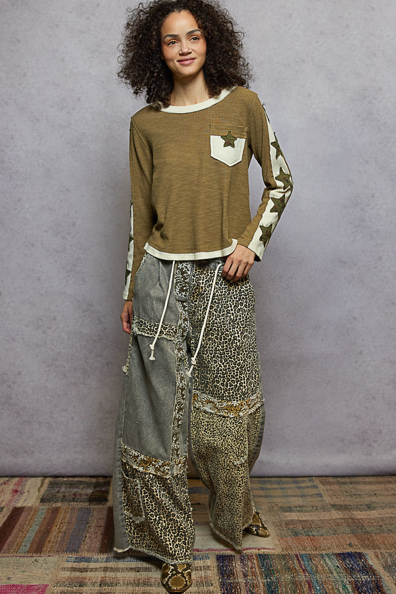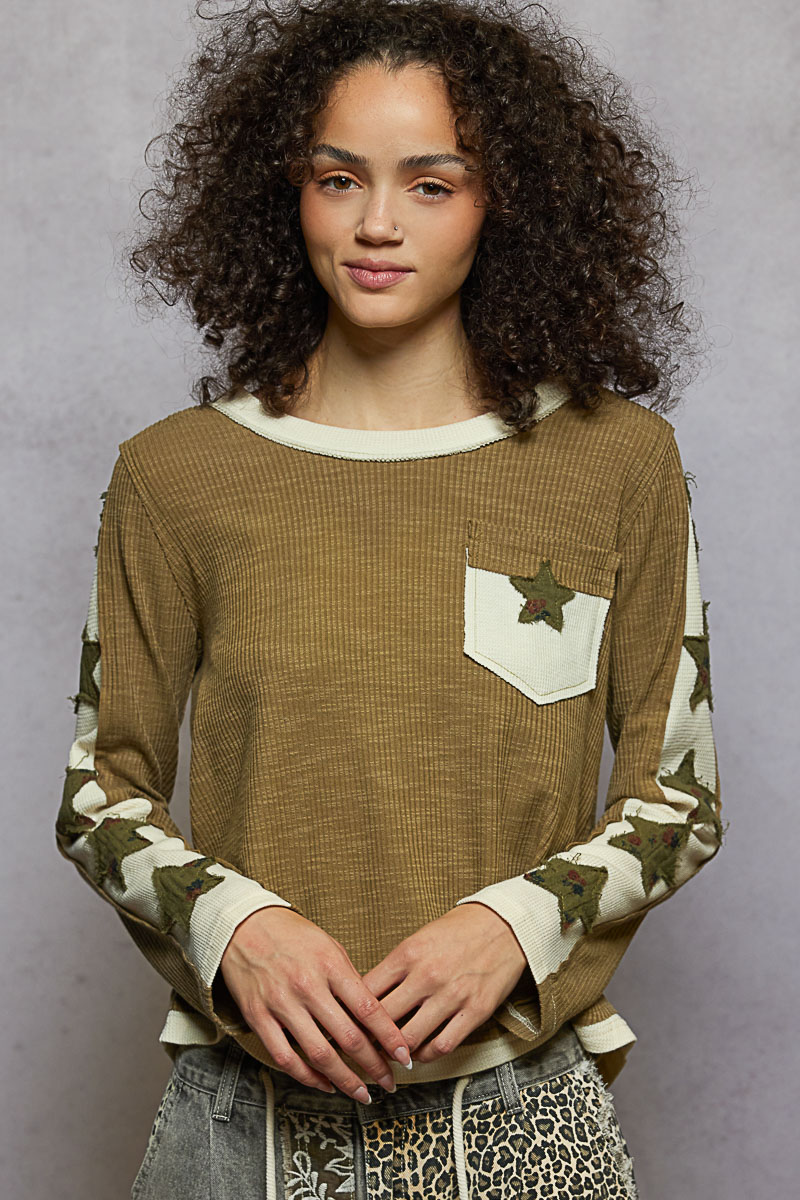 Add a touch of fun to your casual look with this round neck long sleeve t-shirt featuring a star patch. The star patch detail adds a playful and trendy twist to the classic long sleeve tee. Perfect for adding a pop of personality to your outfit. Versatile for layering or wearing on its own for a relaxed yet stylish vibe. Elevate your everyday style with this charming and eye-catching t-shirt.