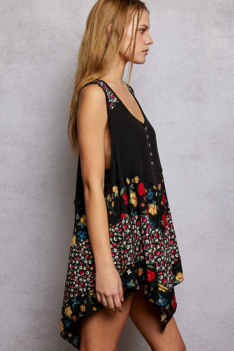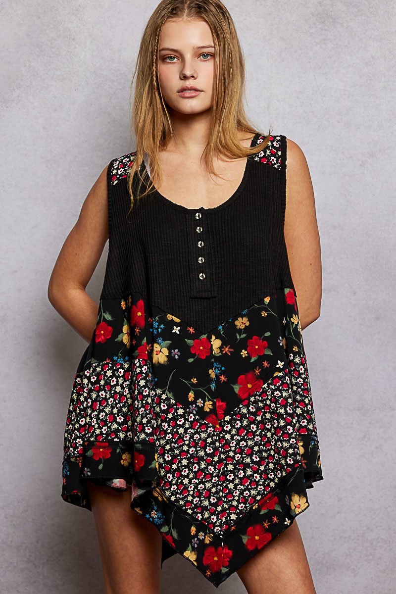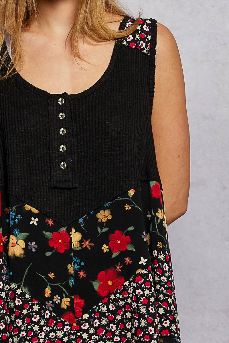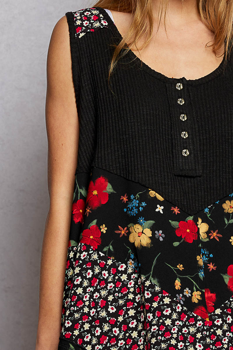 The round neck sleeveless regular fit top is designed with a rib fabric and woven print patch, creating a unique and textured look. With a half placket featuring metal buttons, the top exudes a touch of vintage charm. The vintage washing adds a distressed and lived-in feel to the solid-colored top. This versatile piece is perfect for mixing and matching with various bottoms for different styling options. Embrace a casual and stylish vibe with this top that effortlessly combines comfort and fashion.