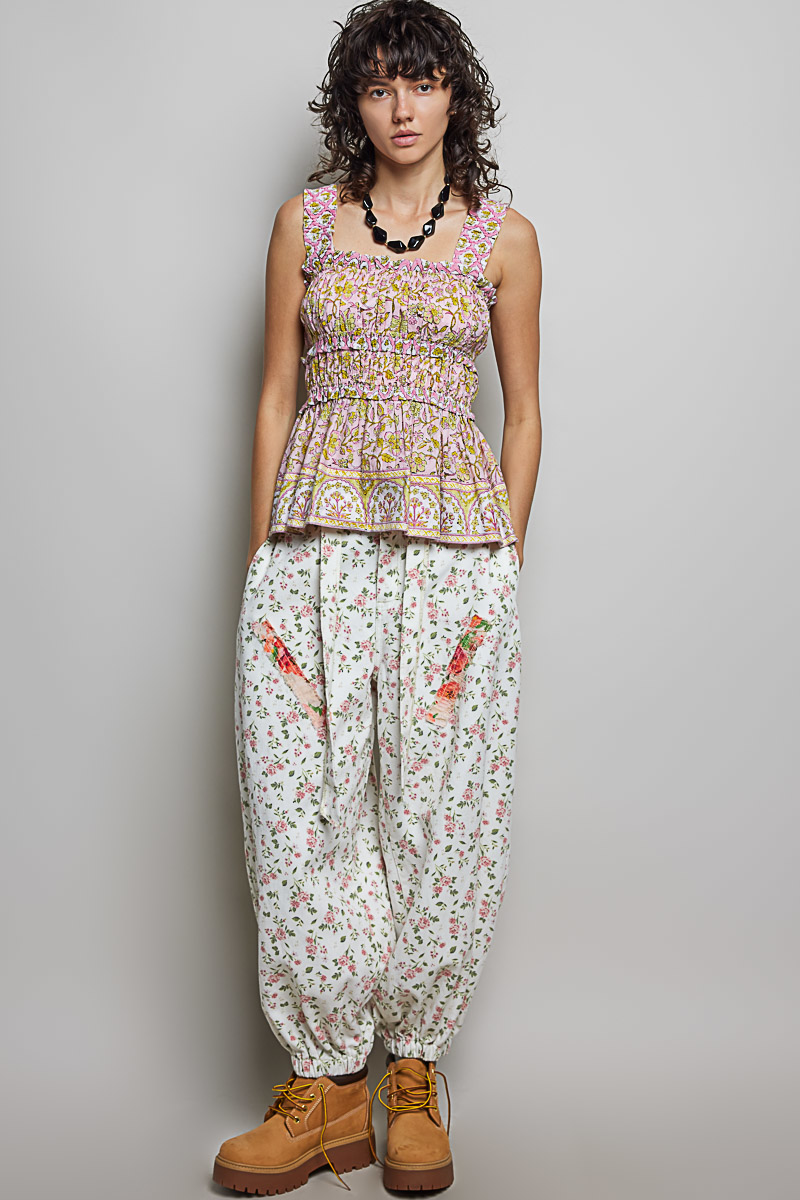 This printed woven sleeveless top is made of lightweight, breathable woven fabric with a soft, comfortable drape. It features a smocked bodice for a gently structured fit and wide shoulder straps for all-day comfort. The square neckline is adorned with delicate ruffle trim, complemented by vibrant folk-inspired prints and contrast border detailing. It is finished with a flared peplum hem that creates natural movement and a flattering, feminine silhouette. Combining artistic patterns and thoughtful design, it effortlessly elevates casual and vacation looks alike.