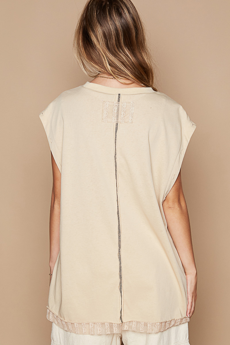 This fashion oversized sleeveless t-shirt features a striking large star graphic adorned with metal studs for an edgy rock-inspired look. Made from soft cotton blend fabric with a vintage washed finish that gives it a lived-in comfortable feel. The relaxed fit and cap sleeves provide effortless style while the crew neckline offers classic appeal. Perfect for casual wear, festival outfits, or layering over tank tops. The raw edge detailing adds to its contemporary street style aesthetic.