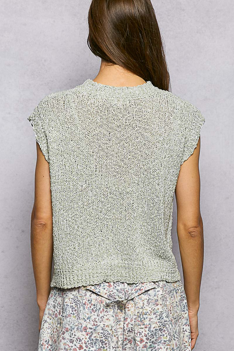 Crafted from a lightweight and airy popcorn knit, this relaxed fit sleeveless sweater features a single, prominent central star motif. This distinct focal point adds a modern, structured visual dimension to the beautifully textured solid patterned base. Finished with classic ribbed band detailing at the rounded neckline and hem, this trans-seasonal piece balances its cozy, tactile touch with a clean, contemporary edge perfect for effortless everyday styling.