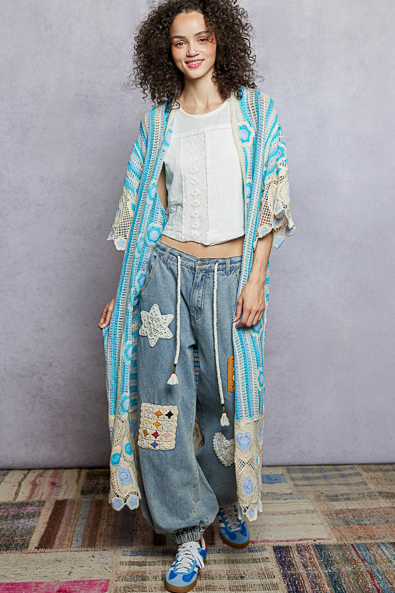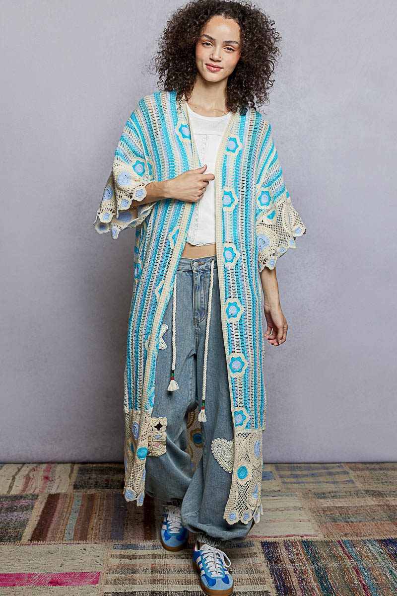 This roomy fit cardigan is designed with 3/4 sleeves and features a beautiful crochet construction with a combination of striped and floral patterns for a unique and stylish look. The border accents add an extra touch of flair to the design, making it a versatile piece for various occasions. Perfect for layering over tops or dresses, this cardigan adds a bohemian and chic vibe to your outfit. Embrace the intricate craftsmanship and on-trend patterns of this cardigan for a fashion-forward ensemble. Update your wardrobe with this statement piece that effortlessly combines style and comfort.