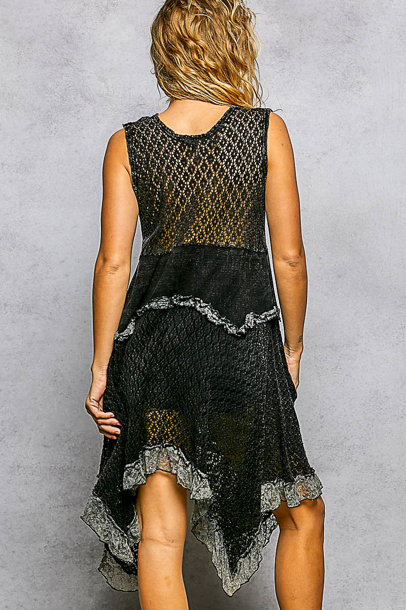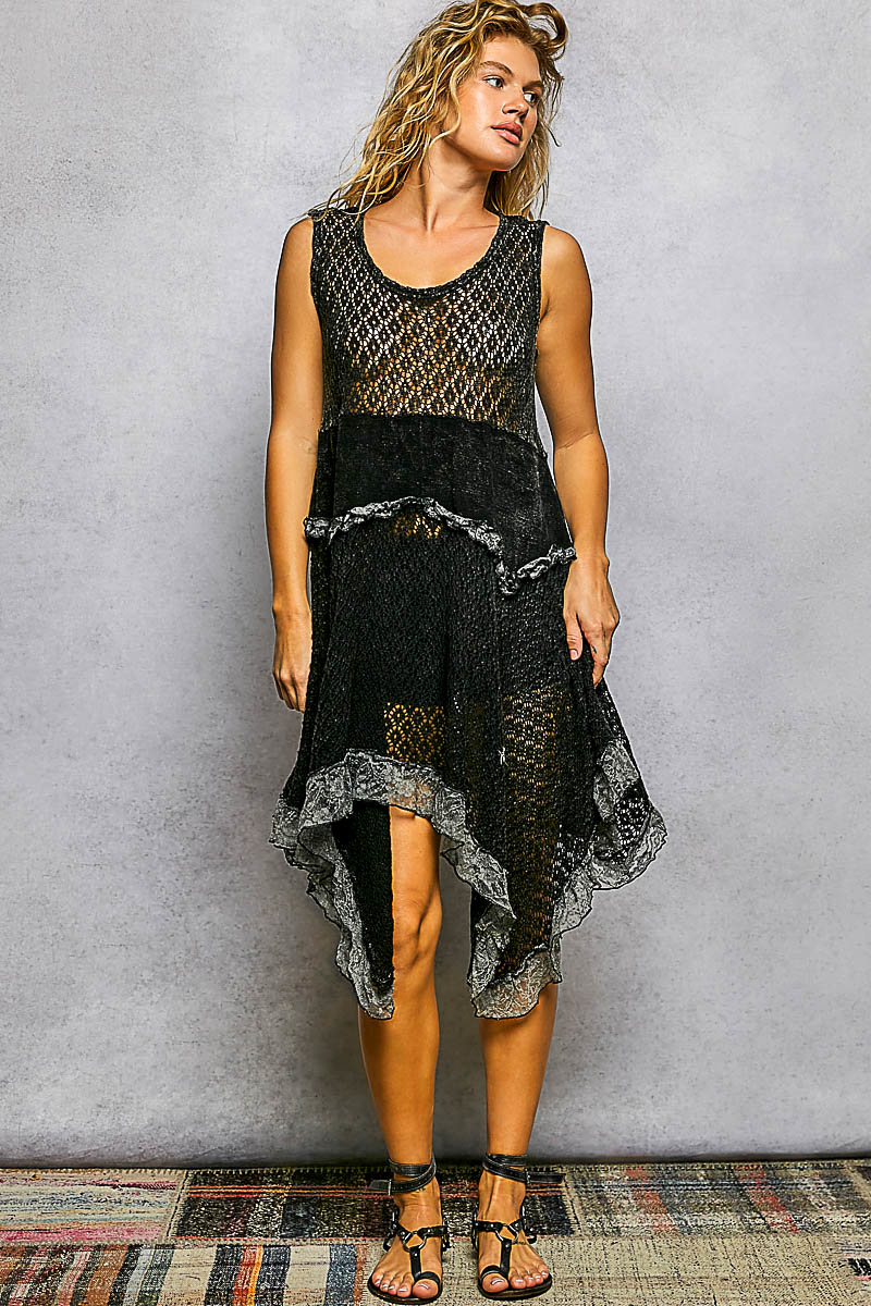 This round-neck sleeveless dress features a flowy handkerchief silhouette, crafted from airy, loosely woven cotton for lightweight comfort. It showcases unique weaving details and delicate lace ruffles along the hem, adding subtle texture and a graceful, romantic finish. Effortlessly breezy and elegantly textured, it’s perfect for everyday wear, vacations, and casual chic occasions.