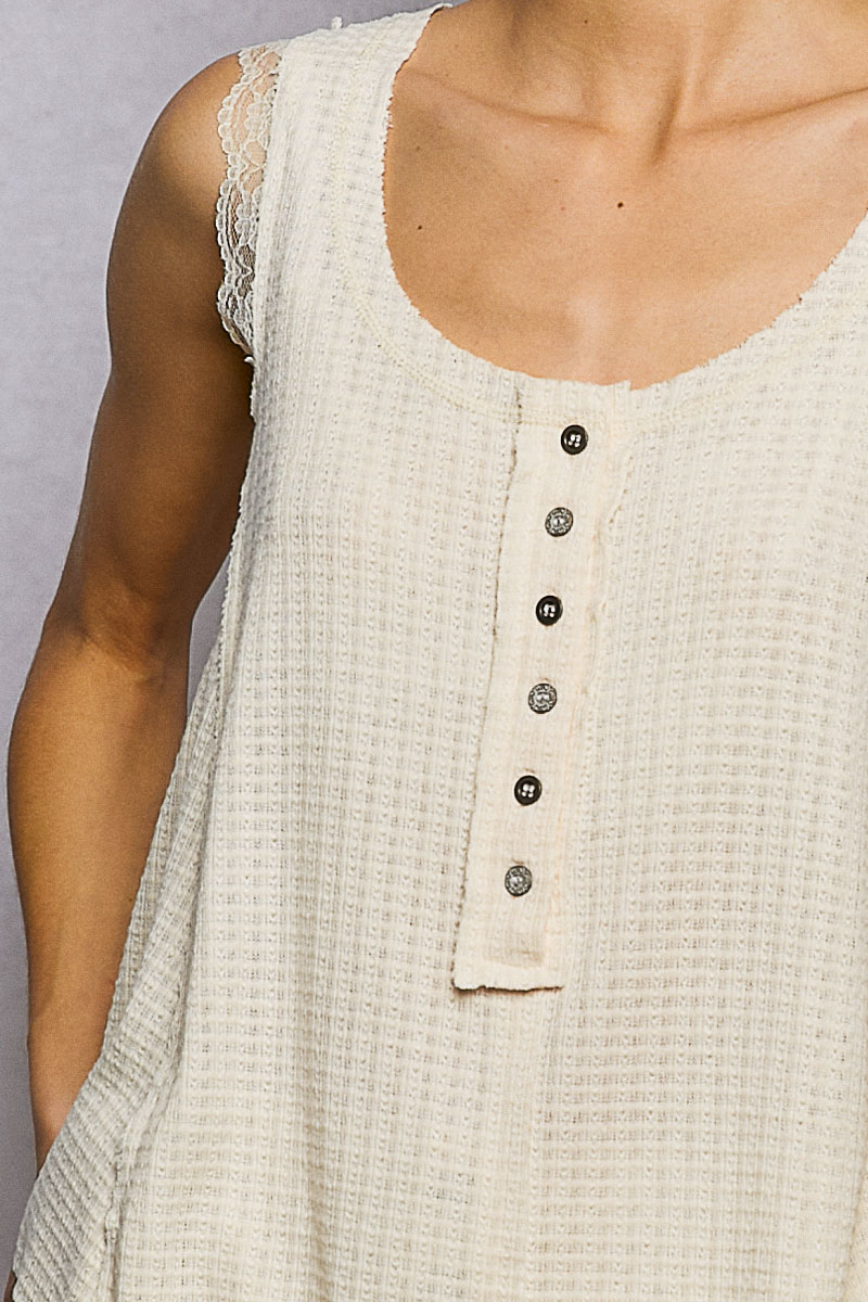 The wide round-neck sleeveless top features intricate wavy lace detailing along the armholes for a touch of elegance. The functional front placket allows for easy opening and closing, adorned with two unique button styles for added charm. Crafted from a soft textured knit fabric, this top offers a comfortable and stylish feel. The flowy A-line silhouette creates a breezy and fluttery fit, perfect for a sophisticated and relaxed look. Whether paired with trousers for a polished office outfit or with jeans for a casual day out, this top is versatile and chic for various occasions.