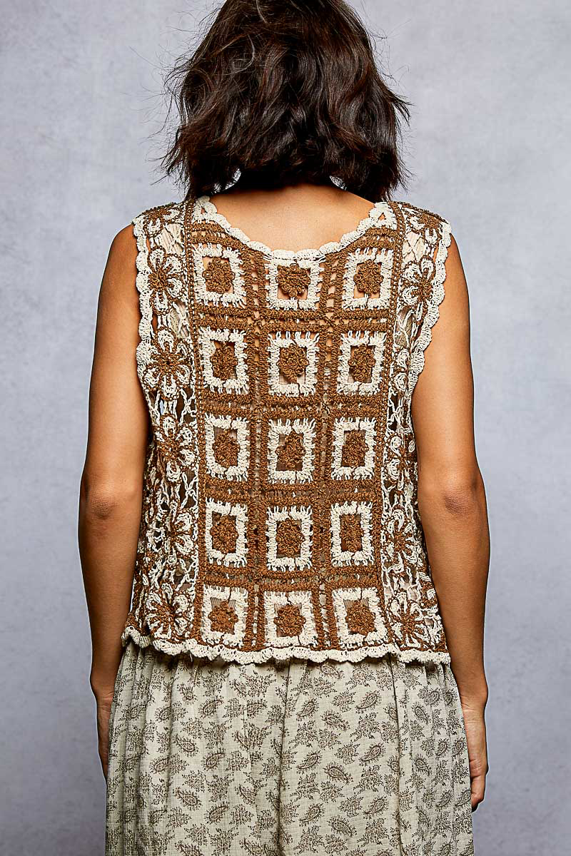 This vest is designed with a round neck, sleeveless cut, and a relaxed fit for a versatile and comfortable style. The crochet fabric features various patterns and a scalloped edge for a charming and intricate look. The accented novelty drawstring detail adds a unique and playful touch to the vest. Perfect for layering over tops for a boho-chic vibe with a touch of whimsy. A stylish and fun addition to your wardrobe for a fresh and trendy outfit option.