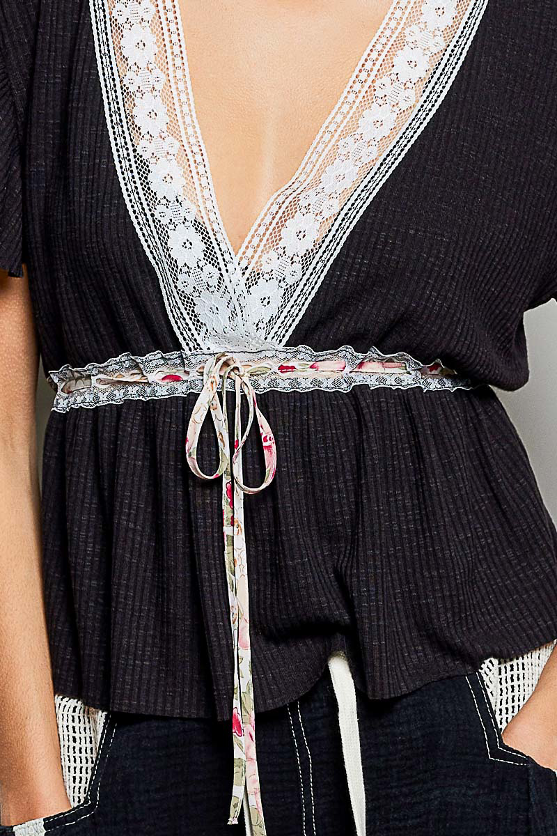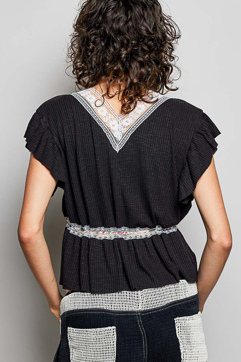 This V-neck sleeveless ribbed top is designed with a regular fit and features a trimmed neckline for a polished look. The adjustable waist trim detail allows for a customizable fit. Raw edges and soft ruffle accents add a touch of charm and texture to the top. Finished with vintage washing in a solid color, creating a relaxed and feminine aesthetic. Perfect for creating a casual yet stylish outfit with a subtle vintage flair.