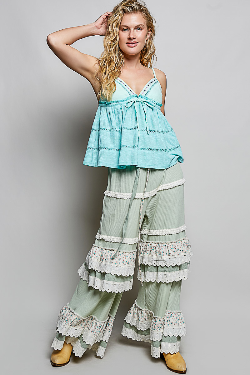 This sleeveless top showcases delicate spaghetti shoulder straps and a tiered body for a flowy silhouette. Embellished with embroidered trim and reversed ruffle details, it offers texture and visual interest. The center front strap on the bodice serves as a subtle focal point. Overall, this airy and visually rich piece exudes elegance and charm. Perfect for adding a touch of sophistication to any outfit.