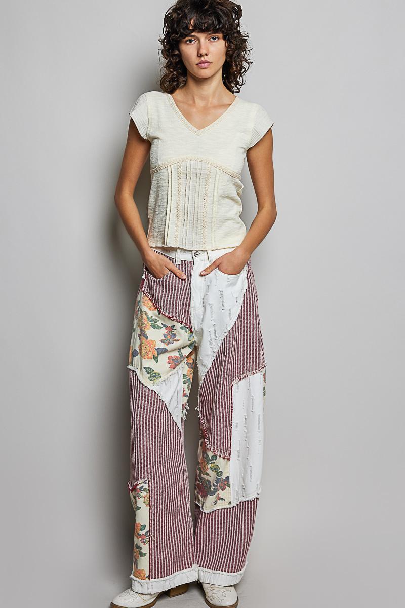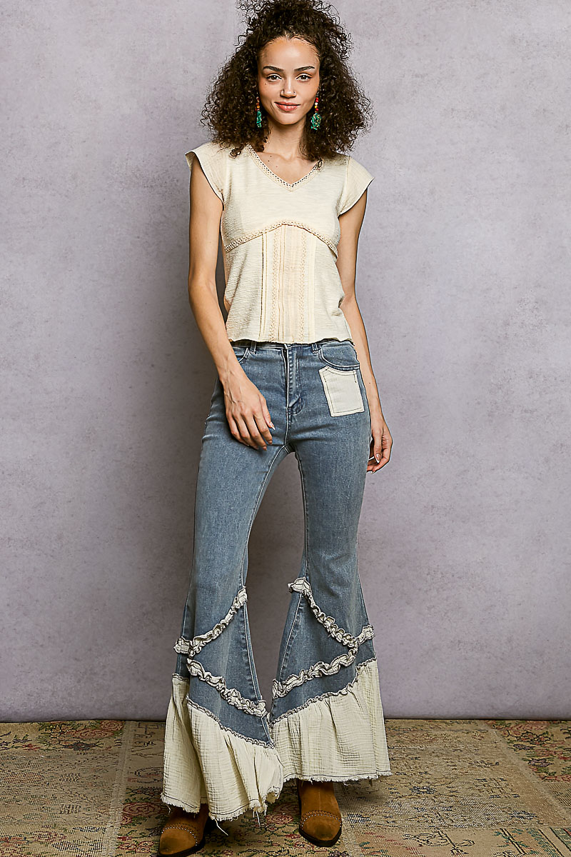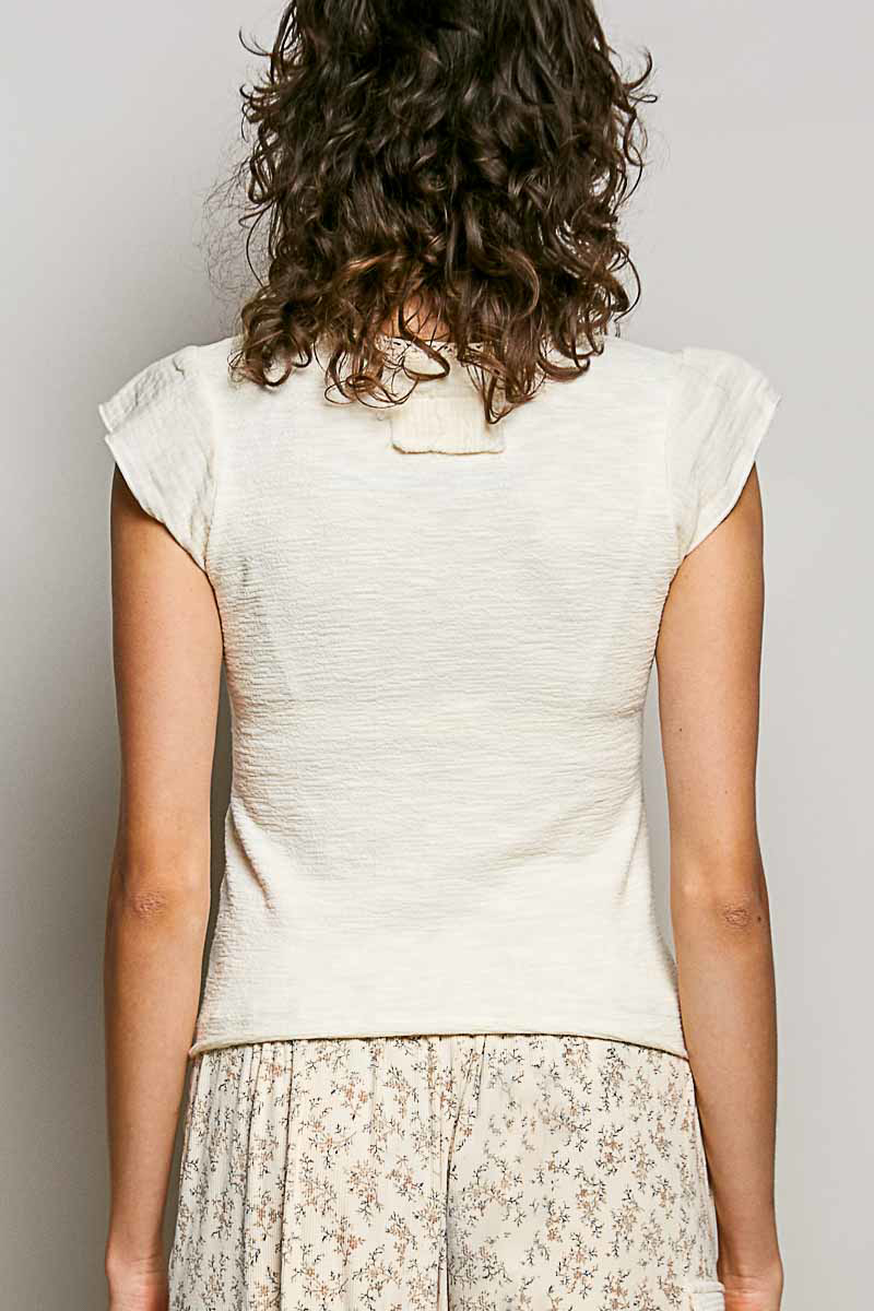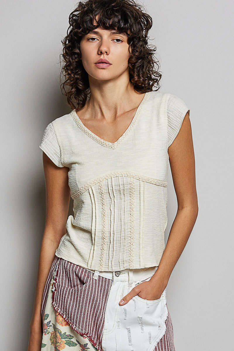 This lightweight textured knit top boasts a flattering silhouette with subtle shaping through the bodice. The V neckline is elegantly trimmed with delicate crochet-style detailing. An empire seam enhances the natural waist, while vertical stitched accents add dimension and a handcrafted feel. Perfect for layering, this top offers effortless everyday styling with a timeless bohemian appeal. Versatile and stylish, it exudes a blend of boho charm and modern elegance.