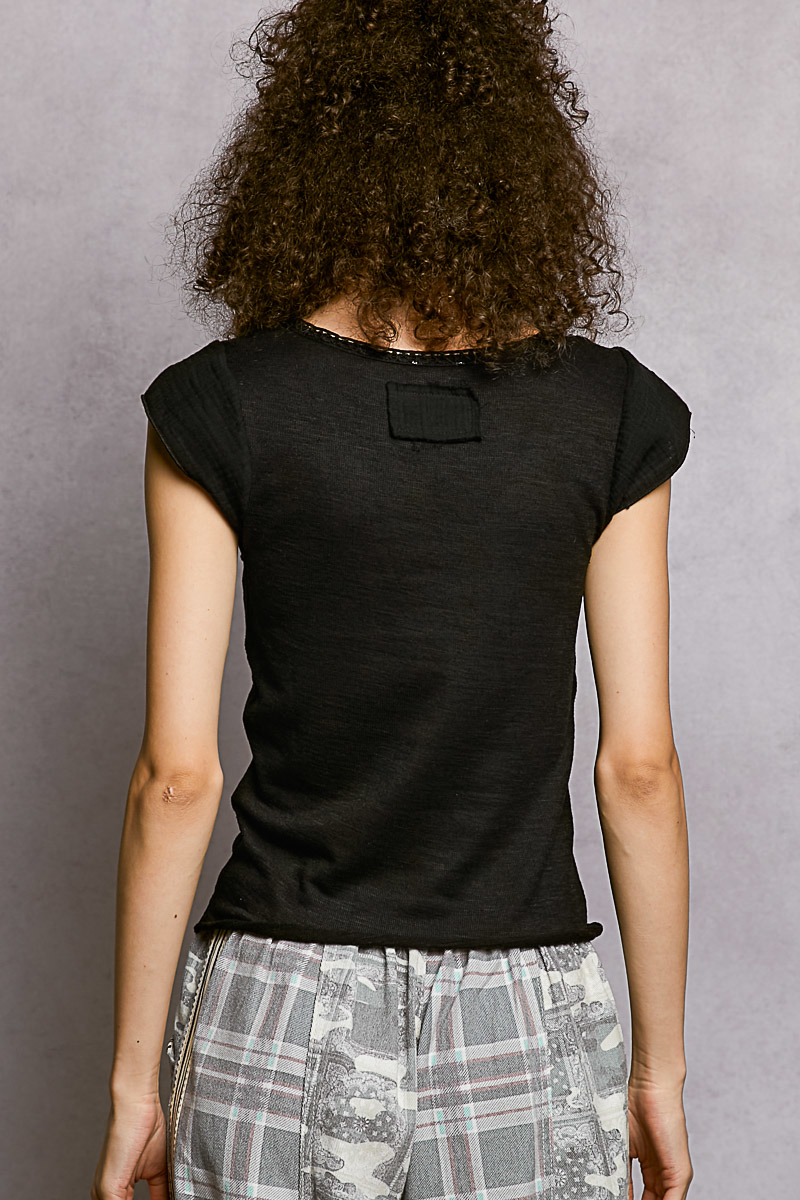 This lightweight textured knit top boasts a flattering silhouette with subtle shaping through the bodice. The V neckline is elegantly trimmed with delicate crochet-style detailing. An empire seam enhances the natural waist, while vertical stitched accents add dimension and a handcrafted feel. Perfect for layering, this top offers effortless everyday styling with a timeless bohemian appeal. Versatile and stylish, it exudes a blend of boho charm and modern elegance.