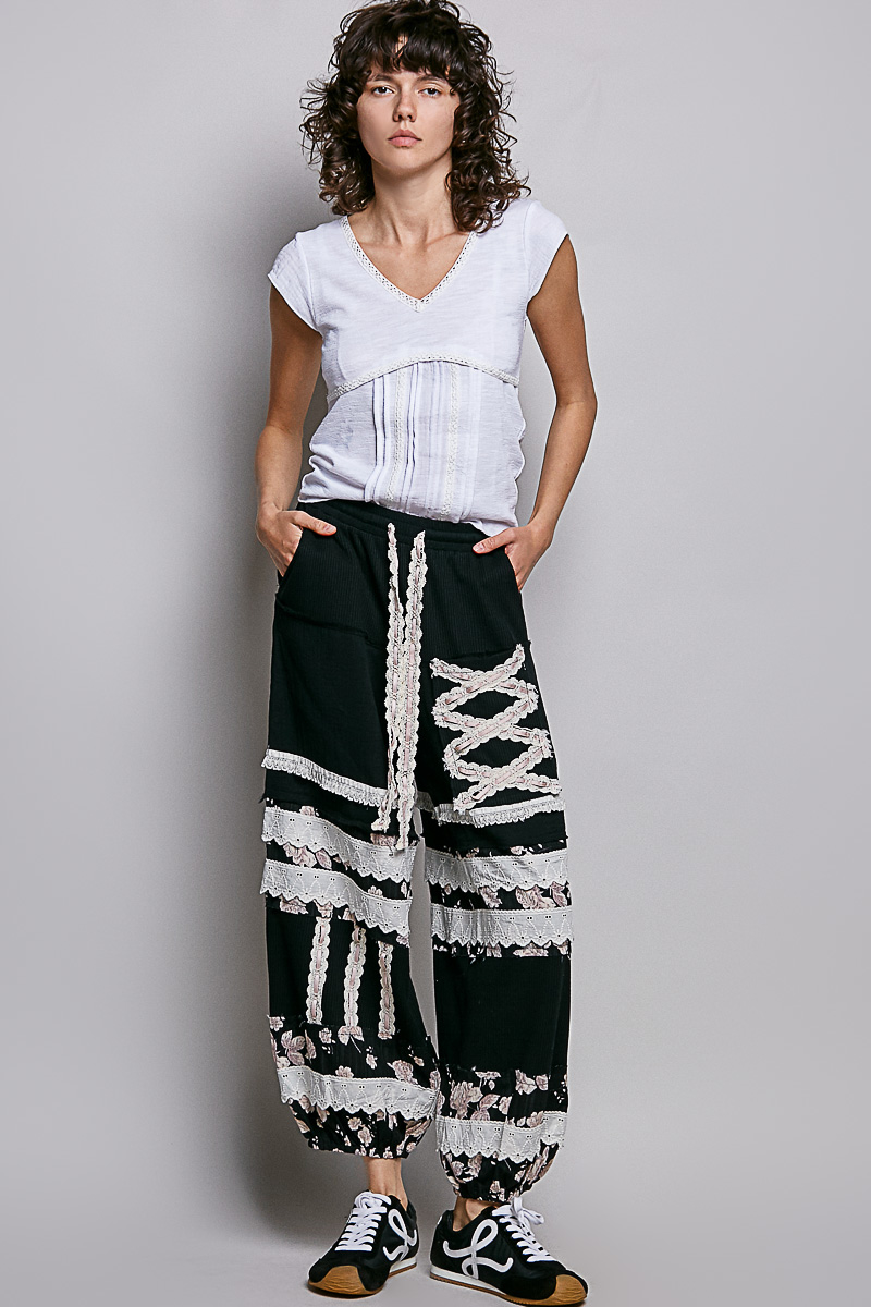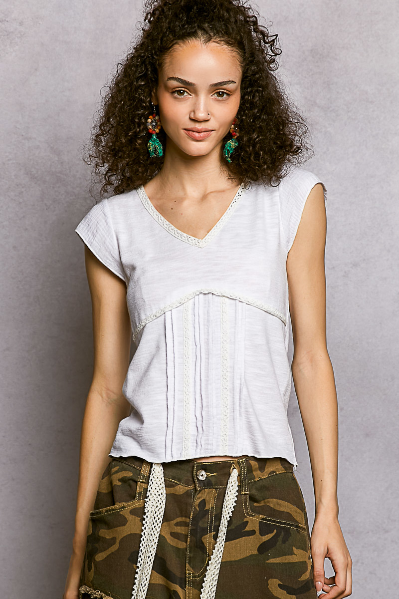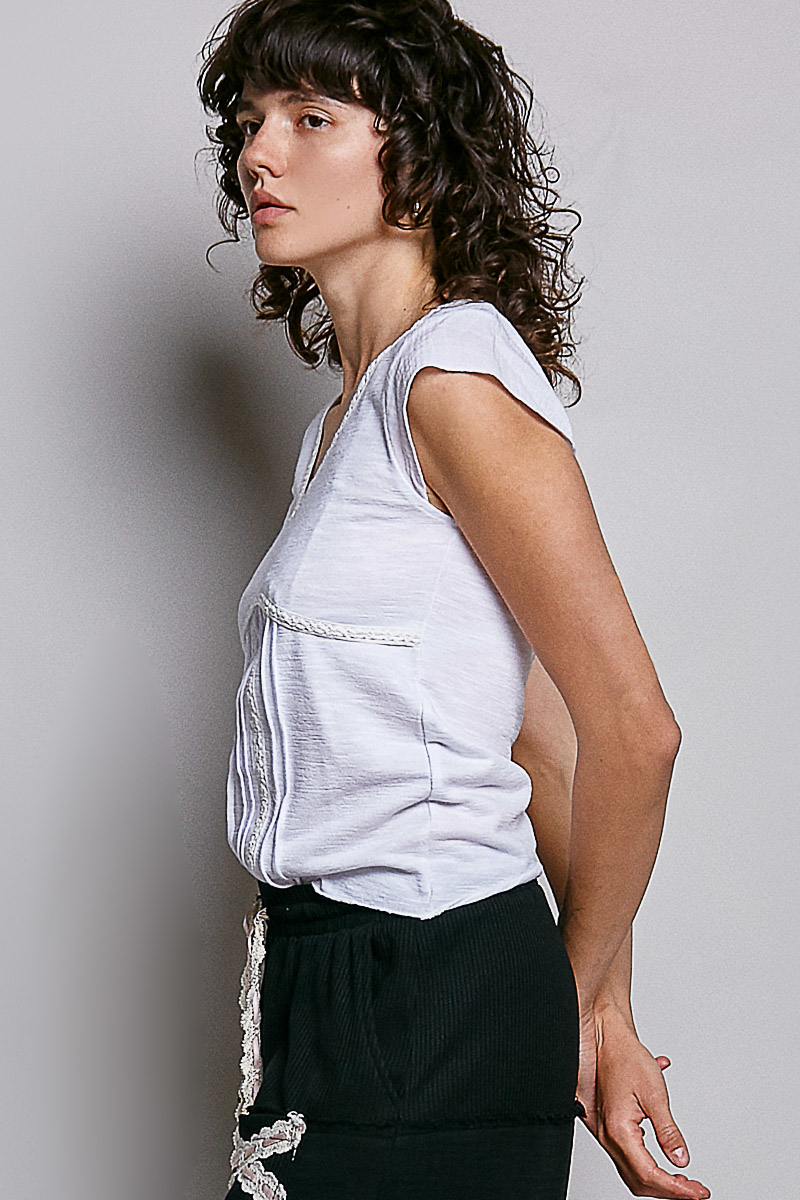 This lightweight textured knit top boasts a flattering silhouette with subtle shaping through the bodice. The V neckline is elegantly trimmed with delicate crochet-style detailing. An empire seam enhances the natural waist, while vertical stitched accents add dimension and a handcrafted feel. Perfect for layering, this top offers effortless everyday styling with a timeless bohemian appeal. Versatile and stylish, it exudes a blend of boho charm and modern elegance.