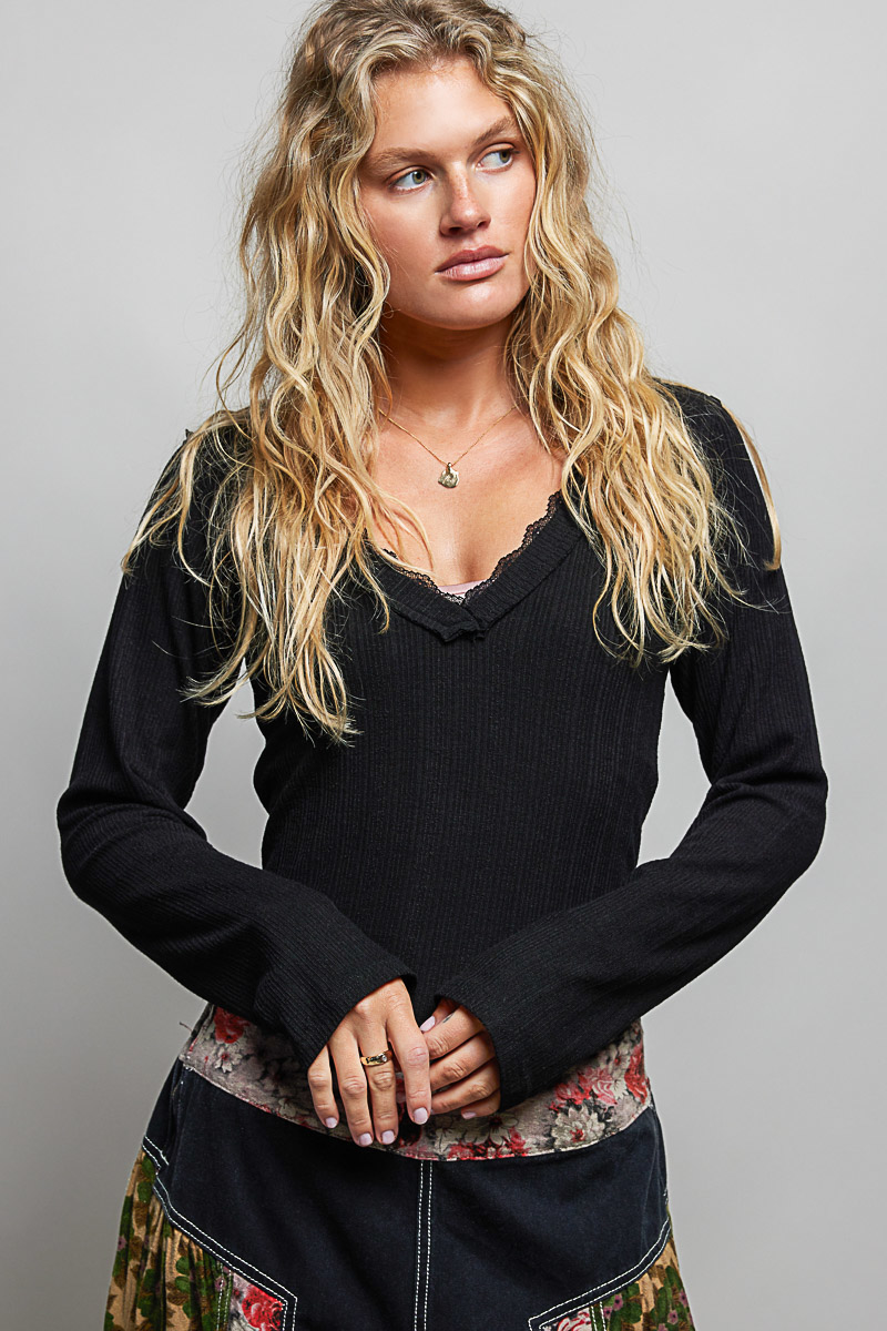 The V-neck long-sleeve slim-fit ribbed top is a sophisticated and versatile wardrobe staple. It showcases a lace-accent neckband and delicate outseam details, adding a touch of elegance to a clean solid-color finish. This top can be effortlessly styled as a chic layering piece or worn on its own for a soft and comfortable everyday look. Perfect for pairing with a skirt or trousers for a polished ensemble, this top transitions seamlessly from day to night. With its flattering slim-fit silhouette and timeless design, it is a must-have essential for any fashion-forward individual.